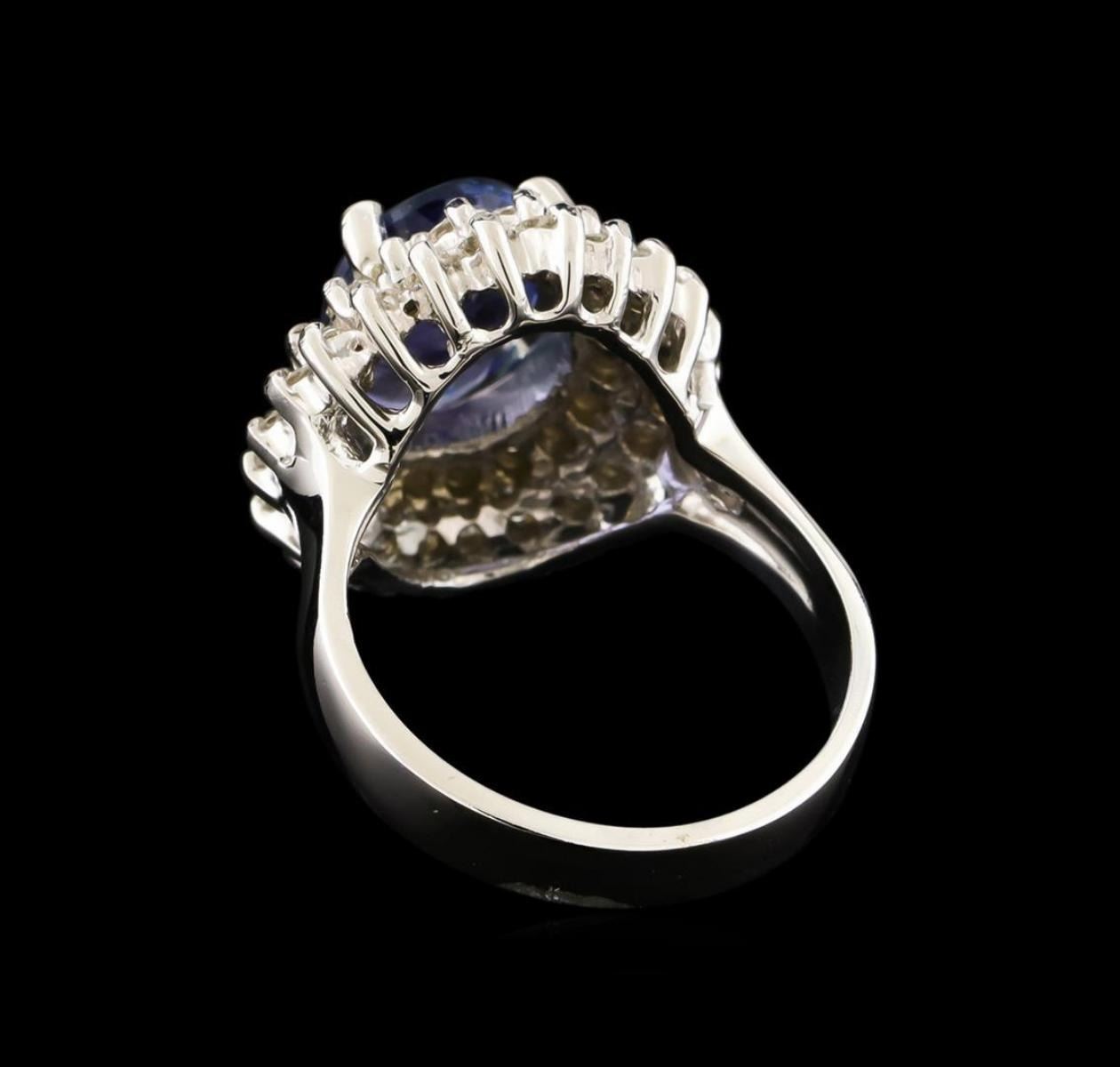One electronically tested 14KT white gold lady's cast fashion ring with a double basket halo with a bright polish finish. The featured lady's ring has a shank measuring 3.44 millimeters wide. Identified with markings of "14K". Condition is new, good workmanship. Containing: One prong set oval modified brilliant cut natural tanzanite, measuring 11.15 x 7.68 x 4.30mm, 7%. bulge factor, approximate weight of 2.75ct., clarity is eye clean, medium light, moderately strong, bluish violet color, (GIA bV 4/4), cut is good. Transmitting light with no distortion, transparent. Colored gemstones are presumed to have been subjected to commonly used enhancement processes. Graded in the setting. Forty prong set round brilliant cut diamonds, measuring 1.90 - 1.80 x 1.15mm (depth est.) approximate total weight of 40 Stones = 0.96ct. Graded in the setting. Clarity: SI-1 to SI-2. Color: G - I. Cut Good. Total Weight of Colored Stones 2.75ct. Total Weight of Diamonds 0.96ct. Total Weight of Ring 6.80gm.