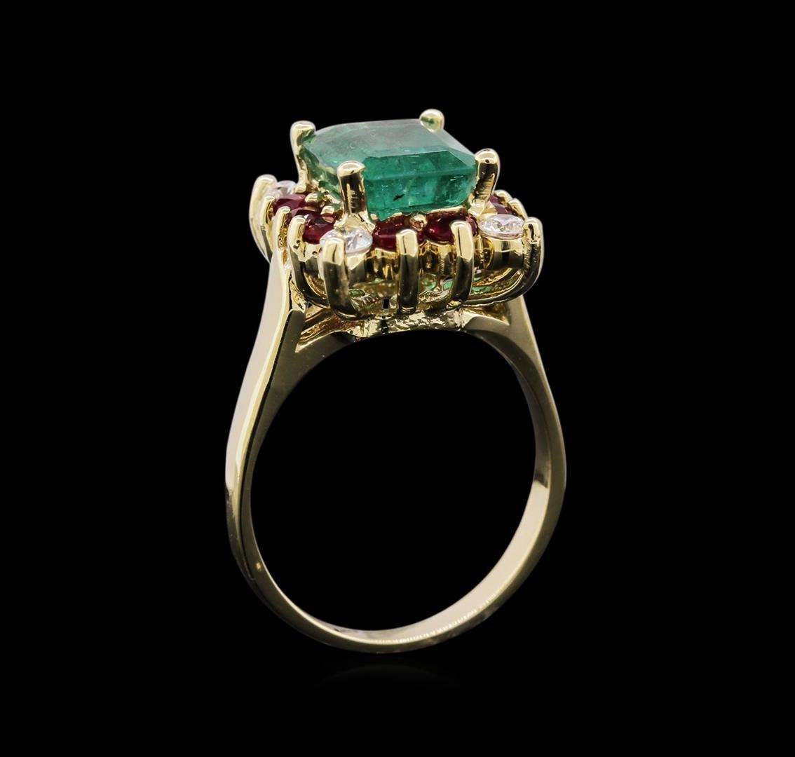 One ring featuring: 14KT white gold weighing 6.60 grams containing one emerald with a total weight of 2.75ct and 10 rubies with a total weight of 1.00ct and side diamonds with a total weight of 0.32ct.
