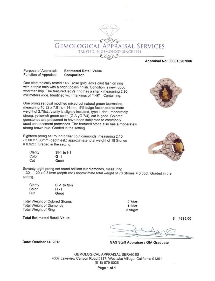One electronically tested 14KT rose gold lady's cast fashion ring with a triple halo with a bright polish finish. The featured lady's ring has a shank measuring 2.90 millimeters wide. Identified with markings of "14K". Condition is new, good workmanship. Containing: One prong set oval modified mixed cut natural green tourmaline, measuring 10.32 x 7.81 x 4.98mm, 5% bulge factor, approximate weight of 2.75ct., clarity is slightly included, type I, dark, moderately strong, yellowish green color, (GIA yG 7/4), cut is good. Colored gemstones are presumed to have been subjected to commonly used enhancement processes. The featured stone also has a moderately strong brown hue. Graded in the setting. Eighteen prong set round brilliant cut diamonds, measuring 2.10 - 2.00 x 1.33mm (depth est.) approximate total weight of 18 Stones = 0.62ct. Graded in the setting. Clarity: SI-1 to I-1. Color: G - I. Cut Good Seventy-Eight prong set round brilliant cut diamonds, measuring 1.30 - 1.20 x 0.81mm (depth est.) approximate total weight of 78 Stones = 0.63ct. Graded in the setting. Clarity: SI-1 to SI-2. Color: H - I. Cut Good. Total Weight of Colored Stones 2.75ct. Total Weight of Diamonds 1.25ct. Total Weight of Ring 5.90gm. GAS Appraised at $4,695.00.