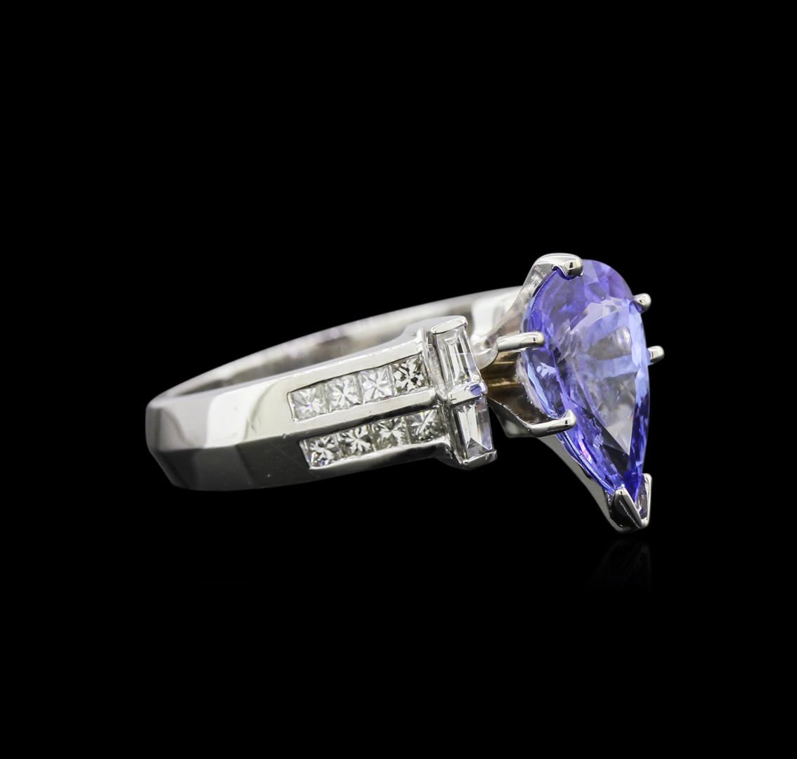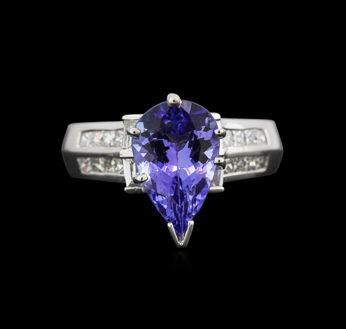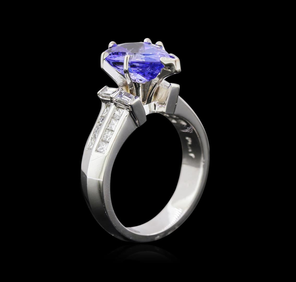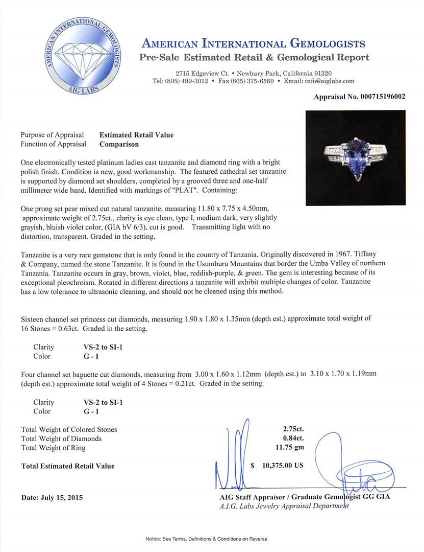 One electronically tested platinum ladies cast tanzanite and diamond ring with a bright polish finish. The featured cathedral set tanzanite is supported by diamond set shoulders, completed by a grooved three and one-half millimeter wide band. Identified w AIG Appraised at $10,375.00.