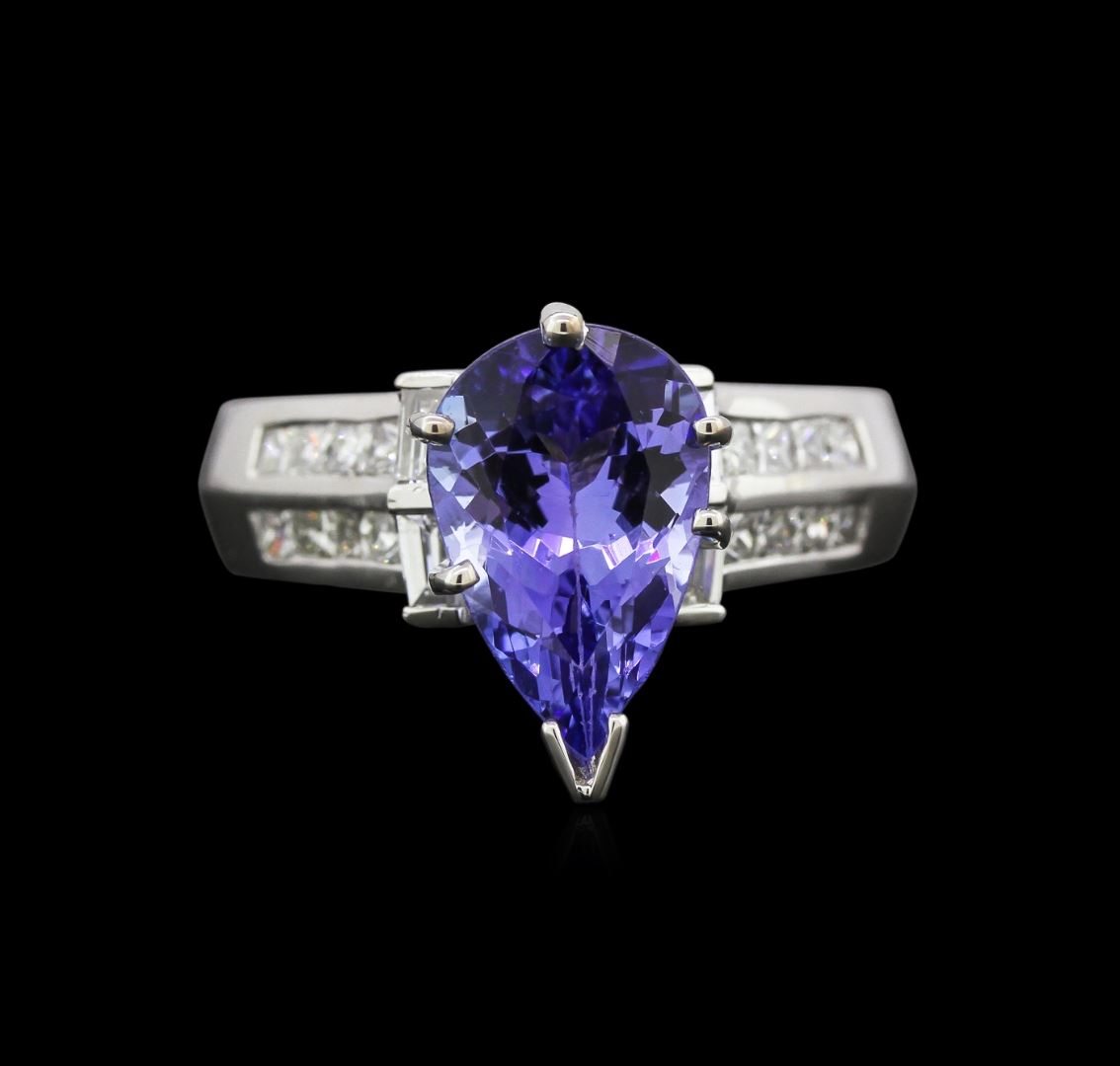 One electronically tested platinum ladies cast tanzanite and diamond ring with a bright polish finish. The featured cathedral set tanzanite is supported by diamond set shoulders, completed by a grooved three and one-half millimeter wide band. Identified with markings of "PLAT". Condition is new, good workmanship. Containing: One prong set pear mixed cut natural tanzanite, measuring 11.80 x 7.75 x 4.50mm, approximate weight of 2.75ct., clarity is eye clean, type I, medium dark, very slightly grayish, bluish violet color, (GIA bV 6/3), cut is good. Transmitting light with no distortion, transparent. Graded in the setting. Tanzanite is a very rare gemstone that is only found in the country of Tanzania. Originally discovered in 1967. Tiffany & Company, named the stone Tanzanite. It is found in the Usumburu Mountains that border the Umba Valley of northern Tanzania. Tanzanite occurs in gray, brown, violet, blue, reddish-purple, & green. The gem is interesting because of its exceptional pleochroism. Rotated in different directions a tanzanite will exhibit multiple changes of color. Tanzanite has a low tolerance to ultrasonic cleaning, and should not be cleaned using this method. Sixteen channel set princess cut diamonds, measuring 1.90 x 1.80 x 1.35mm (depth est.) approximate total weight of 16 Stones = 0.63ct. Graded in the setting. Clarity: VS-2 to SI-1. Color: G - I Four channel set baguette cut diamonds, measuring from 3.00 x 1.60 x 1.12mm (depth est.) to 3.10 x 1.70 x 1.19mm (depth est.) approximate total weight of 4 Stones = 0.21ct. Graded in the setting. Clarity: VS-2 to SI-1. Color: G - I. Total Weight of Colored Stones 2.75ct. Total Weight of Diamonds 0.84ct. Total Weight of Ring 11.75gm. AIG Appraised at $10,375.00.