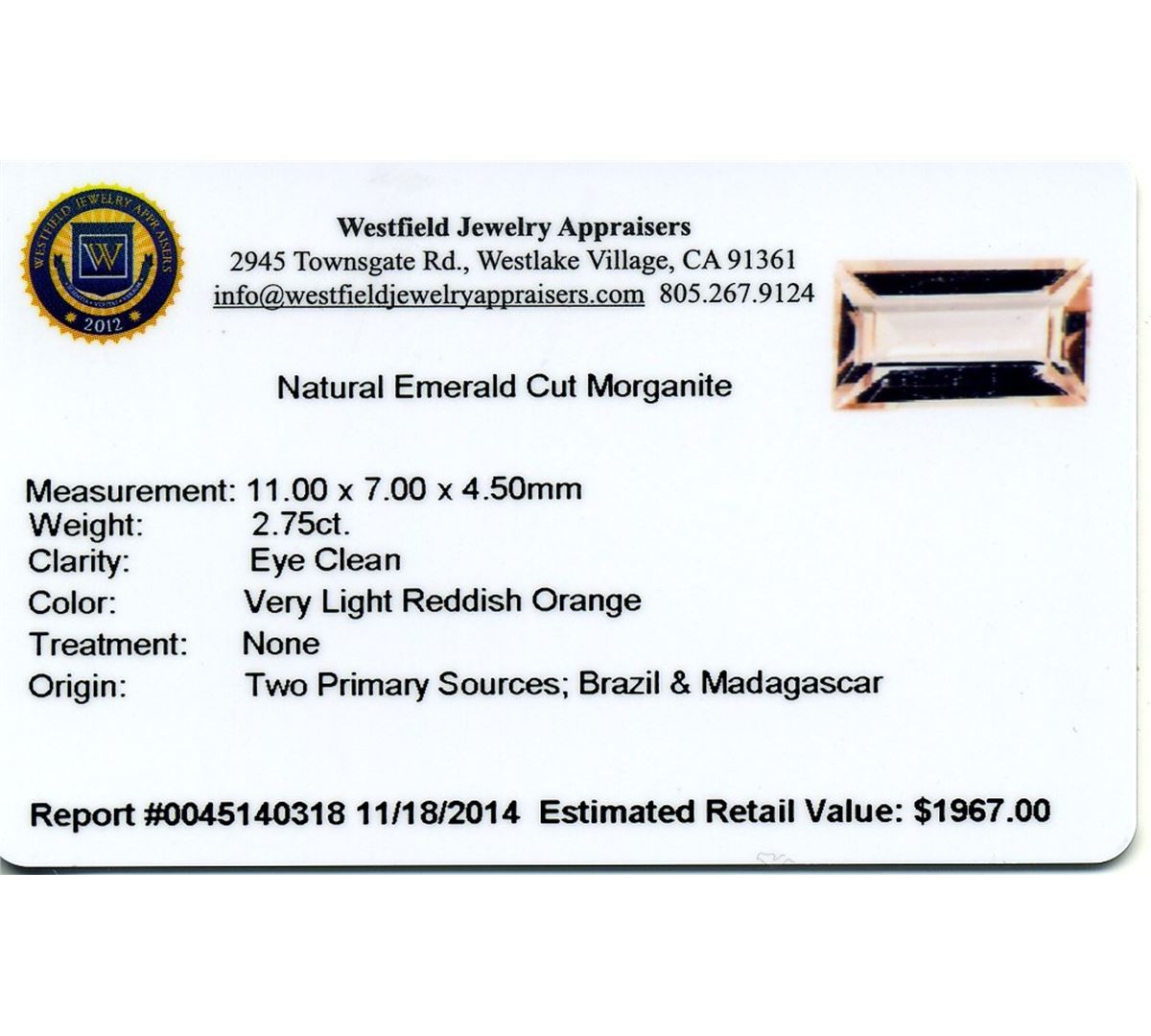2.75ctw. Natural Emerald Cut Morganite. Westfield Appraised at $1,967.00.