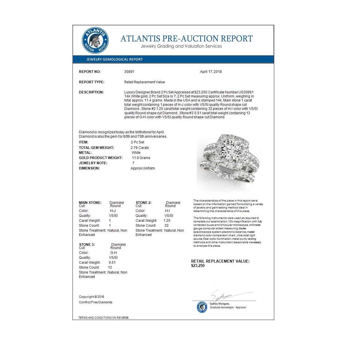REF-469A8X -30891 ---- 2.76 CTW Certified VS/SI Diamond 2Pc Wedding Set Solitaire Halo 14K White Gold ---- Luxury Designer Brand 2 Pc Set Appraised at $23,250 Certificate Number US30891 14k White gold, 2 Pc Set Size is 7, 2 Pc Set measuring approx. Uniform, weighing in total approx. 11.4 grams. Made in the USA and is stamped 14k, Main stone 1 carat total weight containing 1 pieces of H-J color with VS/SI quality Round shape cut Diamond , Stone #2 1.25 carat total weight containing 32 pieces of H-I color with VS/SI quality Round shape cut Diamond , Stone #3 0.51 carat total weight containing 13 pieces of G-H color with VS/SI quality Round shape cut Diamond