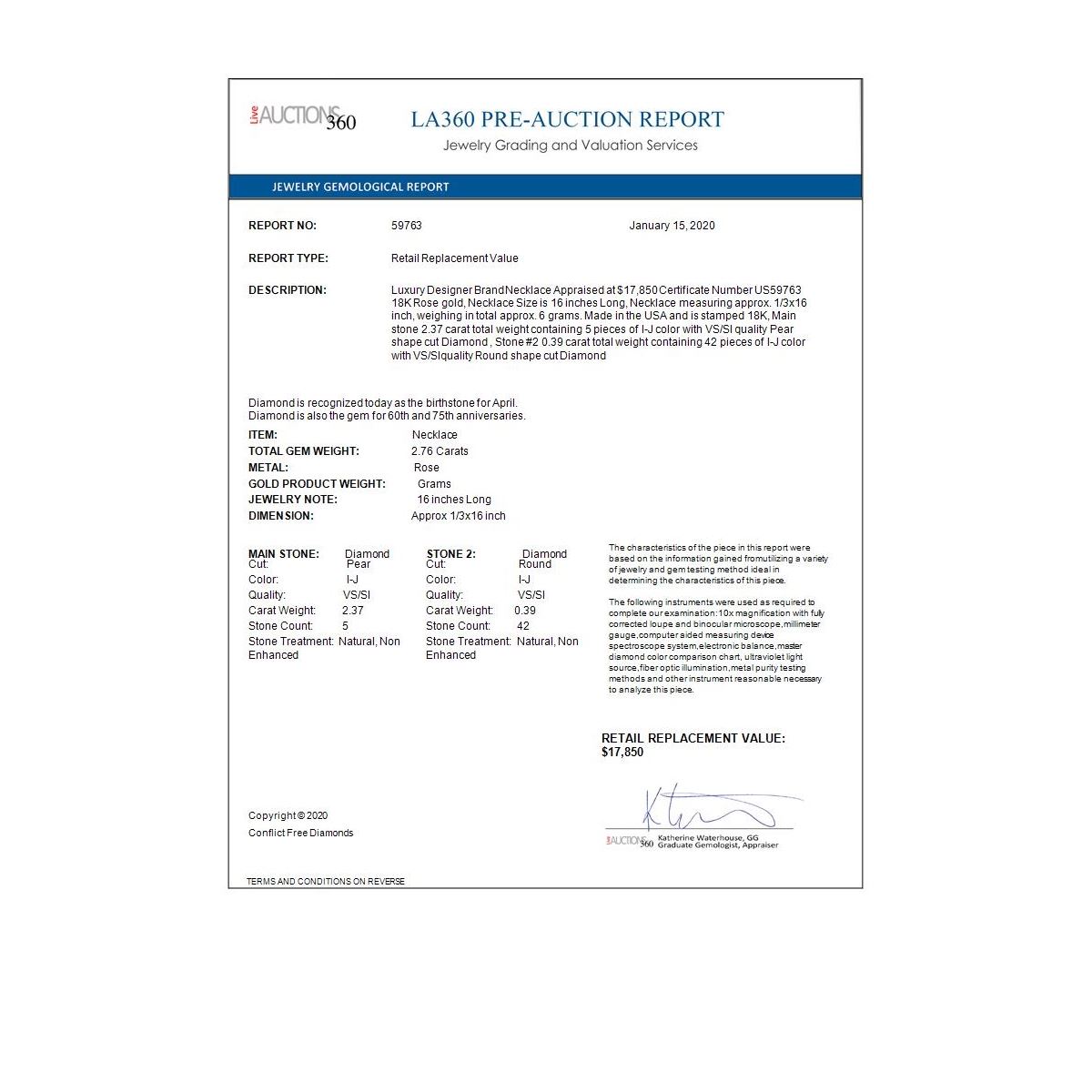 All sales are final, placing a bid is a legally binding obligation. All lots are sold as is, where is, with all the faults, imperfections, omissions and errors in the written description, estimates, appraisals, graphics and photography. USJL is not responsible for any errors or omissions in the description, graphics or photography provided or in the bidding software. Due diligence to verify the condition and description of a lot is the sole responsibility of the Bidder prior to placing any bid. Returns may only be made with the advance written authorization of USJL and are in USJL's sole discretion to approve. To request a return you must provide a written request fully explaining the basis for the return no later than 4 days after your receipt of the lot. Under no circumstances will any amounts other than the winning bid amount be refunded. A restocking charge of 19% of the full invoice amount may apply in USJL 's sole discretion. Any allowed returns must be received in exactly the same condition as when originally shipped to Buyer, or they will be returned to buyer at Buyer's cost. Any unauthorized returns will be refused. DELIVERY REFUSAL OF ITEMS SHIPPED BY US JEWELRY LIQUIDATION TO THE BIDDER CONSTITUTES AN UNAUTHORIZED RETURN IN DIRECT VIOLATION OF THESE GENERAL TERMS AND CONDITIONS.