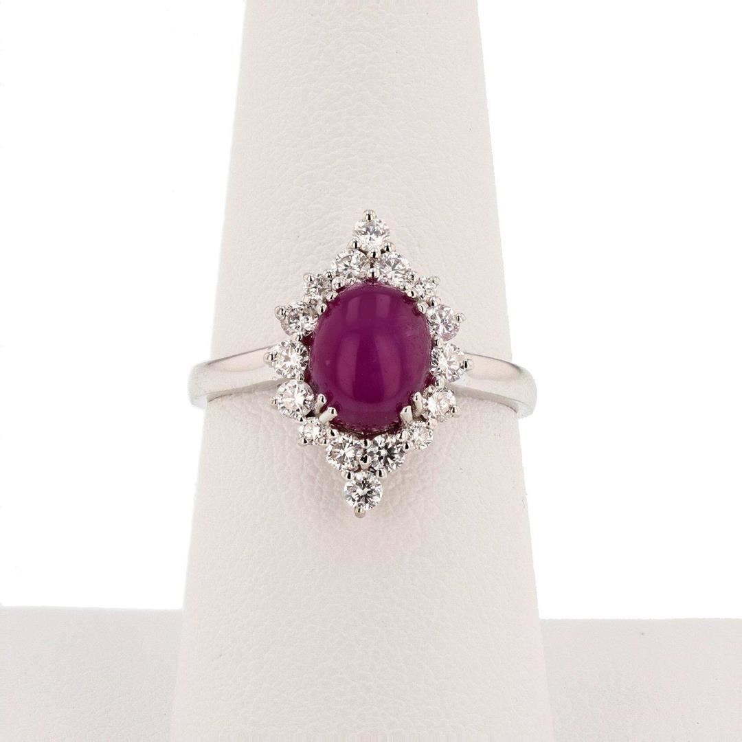 One lady's polished, stamped and electronically tested solid Platinum Ring crafted and signed by Luxury Designer "Orianne" then mounted withal Genuine Oval Cabochon Star Ruby (Corundum) Centerstone hi-lighted by Natural Earth Mined 16 Diamonds. This item weighs 4.10 grams and fits a finger size 7.00. The setting measures 17.20 mm and the band measures 2.16 mm to 1.65 mm at the center of the shank. The condition is BRAND NEW. The gemstones have been analyzed in the mounting. MAIN GEMSTONE IDENTITY: Genuine Star Ruby (Corundum) SHAPE: Oval (Cabochon) MEASUREMENTS: 8.32 x 6.73mm (est.) (no depth) (Range) QUANTITY: 1 CARAT WEIGHT: 2.76ct (est.) CLARITY TYPE: II=may include eye-visible features HUE: Red SECONDARY: Purplish-Red TRANSPARENCY: Translucent TONE: Medium SATURATION: Even-Moderate PHENOMENA: Asterism 6 Rays (Medium) QUALITY: 7 - Very Good ADJACENT GEMSTONES IDENTITY: Natural Earth Mined Diamond CUT: Round Full (Faceted) MEASUREMENTS: 2.20-1.70mm (Est) (no depth) (Range) QUANTITY: 16 (est.) CARAT WEIGHT: 0.54ctw (est.) CLARITY GRADE: SI1/SI2 (Range) COLOR GRADE: F - G (Range) CUT GRADE: 7 - Very Good (Overall) GEMSTONE CARAT WEIGHT: 2.76ct DIAMOND CARAT WEIGHT: 0.54ctw ITEM GRAM WEIGHT: 4.10 grams