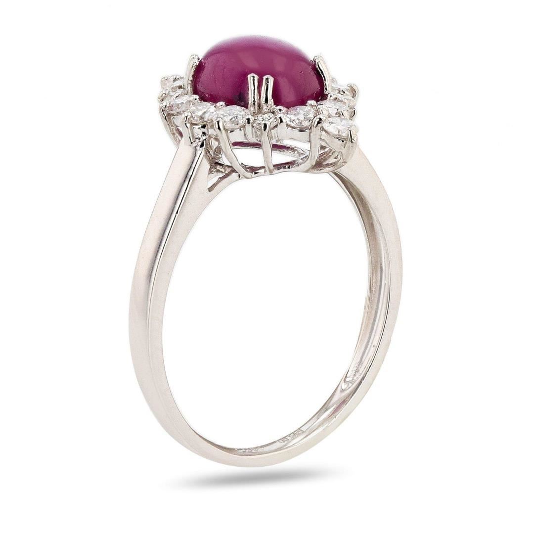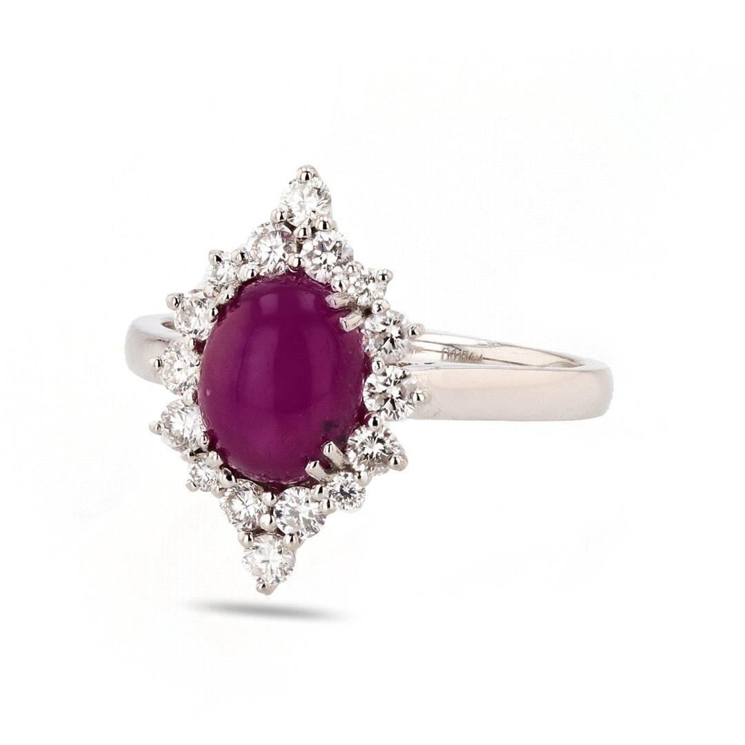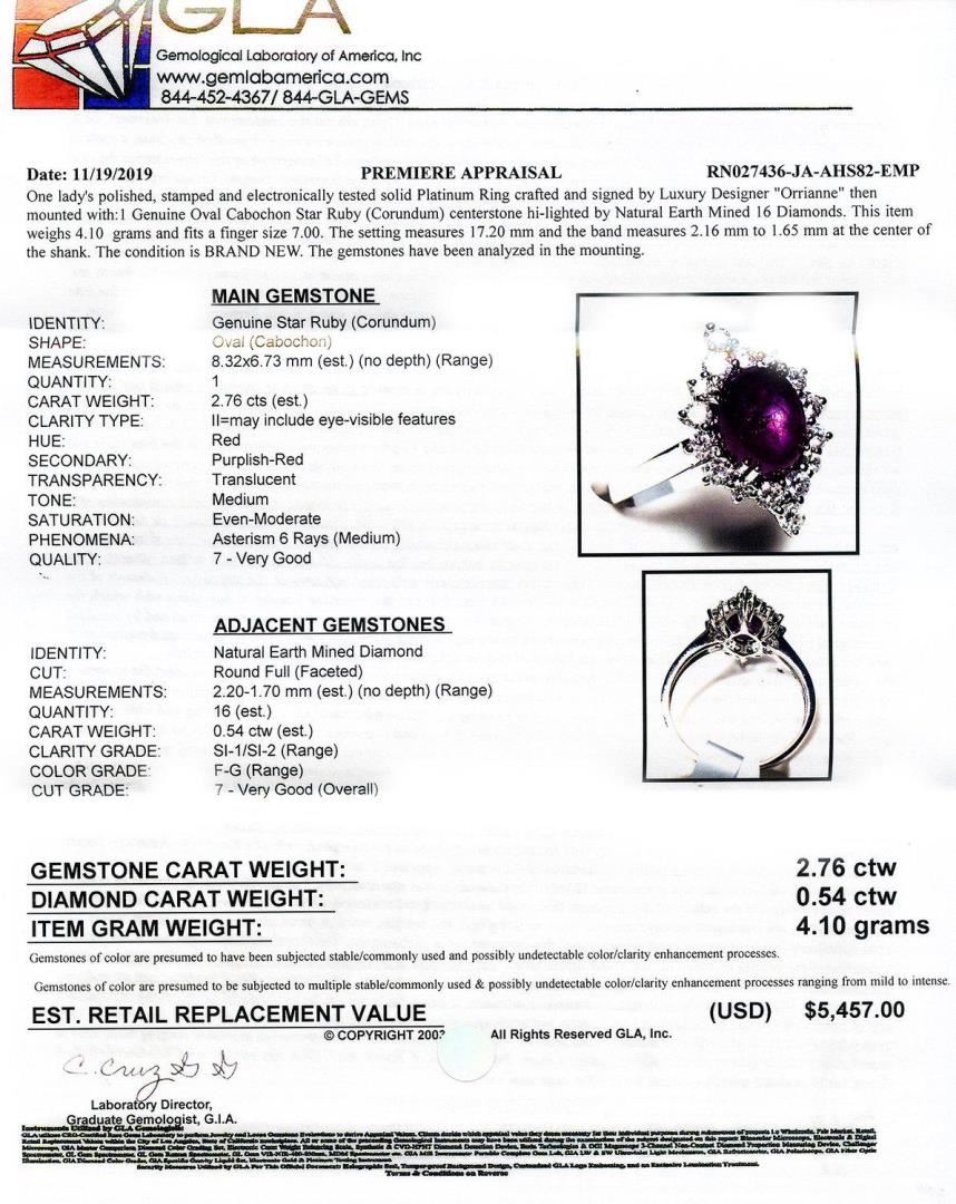 One lady's polished, stamped and electronically tested solid Platinum Ring crafted and signed by Luxury Designer "Orianne" then mounted withal Genuine Oval Cabochon Star Ruby (Corundum) Centerstone hi-lighted by Natural Earth Mined 16 Diamonds. This item weighs 4.10 grams and fits a finger size 7.00. The setting measures 17.20 mm and the band measures 2.16 mm to 1.65 mm at the center of the shank. The condition is BRAND NEW. The gemstones have been analyzed in the mounting. MAIN GEMSTONE IDENTITY: Genuine Star Ruby (Corundum) SHAPE: Oval (Cabochon) MEASUREMENTS: 8.32 x 6.73mm (est.) (no depth) (Range) QUANTITY: 1 CARAT WEIGHT: 2.76ct (est.) CLARITY TYPE: II=may include eye-visible features HUE: Red SECONDARY: Purplish-Red TRANSPARENCY: Translucent TONE: Medium SATURATION: Even-Moderate PHENOMENA: Asterism 6 Rays (Medium) QUALITY: 7 - Very Good ADJACENT GEMSTONES IDENTITY: Natural Earth Mined Diamond CUT: Round Full (Faceted) MEASUREMENTS: 2.20-1.70mm (Est) (no depth) (Range) QUANTITY: 16 (est.) CARAT WEIGHT: 0.54ctw (est.) CLARITY GRADE: SI1/SI2 (Range) COLOR GRADE: F - G (Range) CUT GRADE: 7 - Very Good (Overall) GEMSTONE CARAT WEIGHT: 2.76ct DIAMOND CARAT WEIGHT: 0.54ctw ITEM GRAM WEIGHT: 4.10 grams