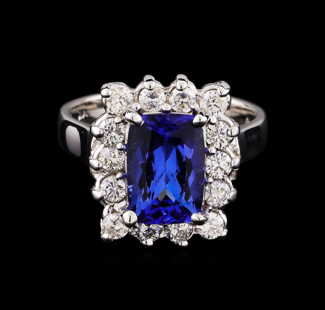 One electronically tested 14KT white gold lady's cast fashion ring with a basket halo with a bright polish finish. The featured lady's ring has a shank measuring 2.90 millimeters wide. Identified with markings of "14K". Condition is new, good workmanship. Containing: One prong set rectangular cushion modified brilliant cut natural tanzanite, measuring 10.05 x 6.98 x 4.77mm, 5%. bulge factor, approximate weight of 2.76ct., clarity is eye clean, medium dark, moderately strong, violetish blue color, (GIA vB 6/4), cut is very good. Transmitting light with no distortion, transparent. Colored gemstones are presumed to have been subjected to commonly used enhancement processes. Graded in the setting. Fourteen prong set round brilliant cut diamonds, measuring 2.50 - 2.40 x 1.52mm (depth est.) approximate total weight of 14 Stones = 0.80ct. Graded in the setting. Clarity: SI-1 to SI-2. Color: H - I. Cut Good. Total Weight of Colored Stones 2.76ct. Total Weight of Diamonds 0.80ct. Total Weight of Ring 6.40gm. GAS Appraised at $7,105.00.