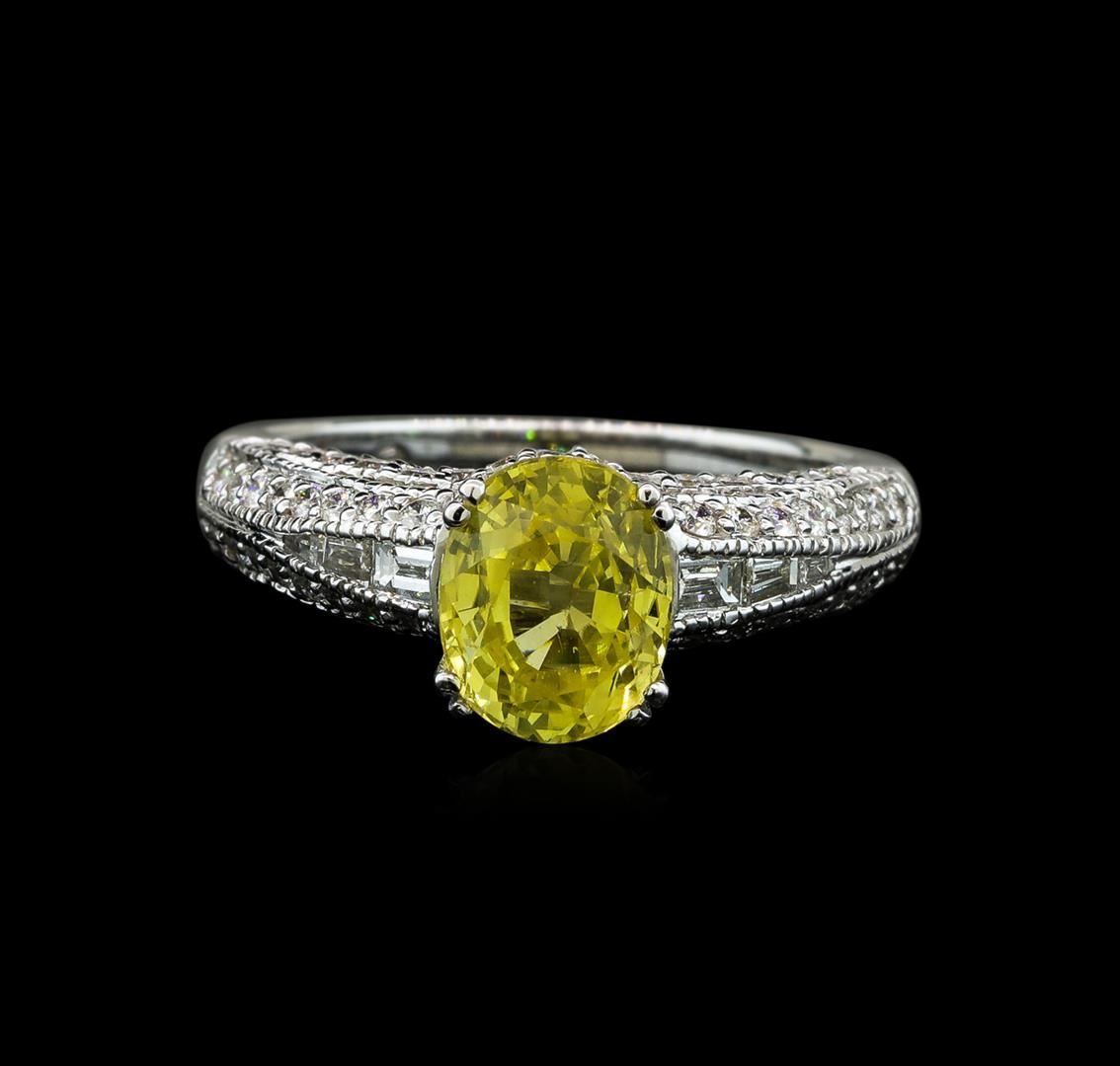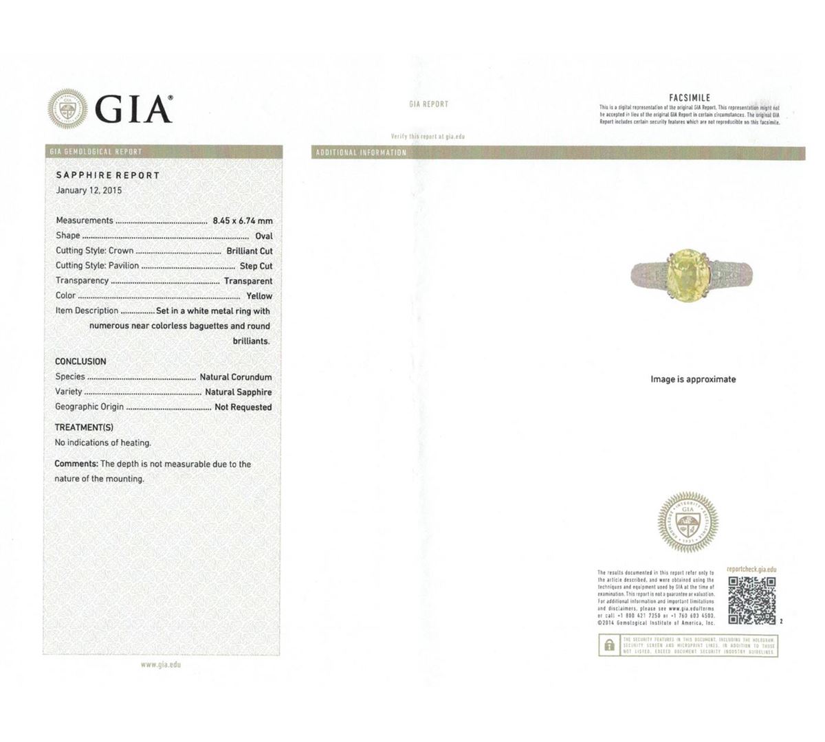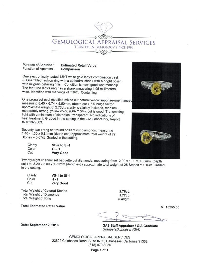 One electronically tested 18KT white gold lady's combination cast & assembled fashion ring with a cathedral shank with a bright polish with milgrain detailing finish. The featured lady's ring has a shank measuring 1.95 millimeters wide. Identified with markings of '18K'. Condition is new, good workmanship. Containing: One prong set oval modified mixed cut natural yellow sapphire-unenhanced, measuring 8.45 x 6.74 x 5.50mm, (depth est.) 5%. bulge factor, approximate weight of 2.76ct., clarity is slightly included, medium, moderately strong, yellow color, (GIA Y 5/4), cut is good. Transmitting light with a minimum of distortion, transparent. No indications of heat treatment. Graded in the setting in the GIA Laboratory, Report #2161929563. Seventy-Two prong set round brilliant cut diamonds, measuring 1.40 - 1.30 x 0.84mm (depth est.) approximate total weight of 72 Stones = 0.67ct. Graded in the setting. Clarity VS-2 to SI-1. Color: G - H Cut Very Good Twenty-Eight channel set baguette cut diamonds, measuring from 2.00 x 1.00 x 0.85mm (depth est.) to 3.20 x 2.00 x 1.70mm (depth est.) approximate total weight of 28 Stones = 1.10ct. Graded in the setting. Clarity VS-1 to SI-1. Color: H - I Cut Very Good. Total Weight of Colored Stones 2.76ct.. Total Weight of Diamonds 1.77ct.. Total Weight of Ring 5.40gm GAS Appraised at $13,255.00.