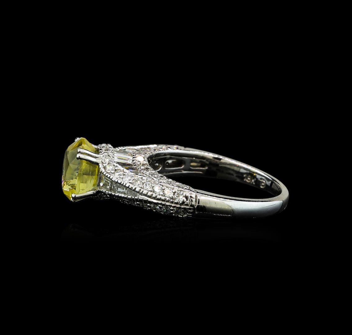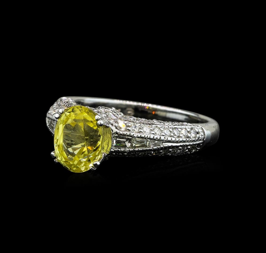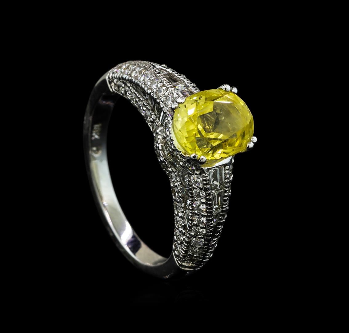 One electronically tested 18KT white gold lady's combination cast & assembled fashion ring with a cathedral shank with a bright polish with milgrain detailing finish. The featured lady's ring has a shank measuring 1.95 millimeters wide. Identified with markings of '18K'. Condition is new, good workmanship. Containing: One prong set oval modified mixed cut natural yellow sapphire-unenhanced, measuring 8.45 x 6.74 x 5.50mm, (depth est.) 5%. bulge factor, approximate weight of 2.76ct., clarity is slightly included, medium, moderately strong, yellow color, (GIA Y 5/4), cut is good. Transmitting light with a minimum of distortion, transparent. No indications of heat treatment. Graded in the setting in the GIA Laboratory, Report #2161929563. Seventy-Two prong set round brilliant cut diamonds, measuring 1.40 - 1.30 x 0.84mm (depth est.) approximate total weight of 72 Stones = 0.67ct. Graded in the setting. Clarity VS-2 to SI-1. Color: G - H Cut Very Good Twenty-Eight channel set baguette cut diamonds, measuring from 2.00 x 1.00 x 0.85mm (depth est.) to 3.20 x 2.00 x 1.70mm (depth est.) approximate total weight of 28 Stones = 1.10ct. Graded in the setting. Clarity VS-1 to SI-1. Color: H - I Cut Very Good. Total Weight of Colored Stones 2.76ct.. Total Weight of Diamonds 1.77ct.. Total Weight of Ring 5.40gm GAS Appraised at $13,255.00.