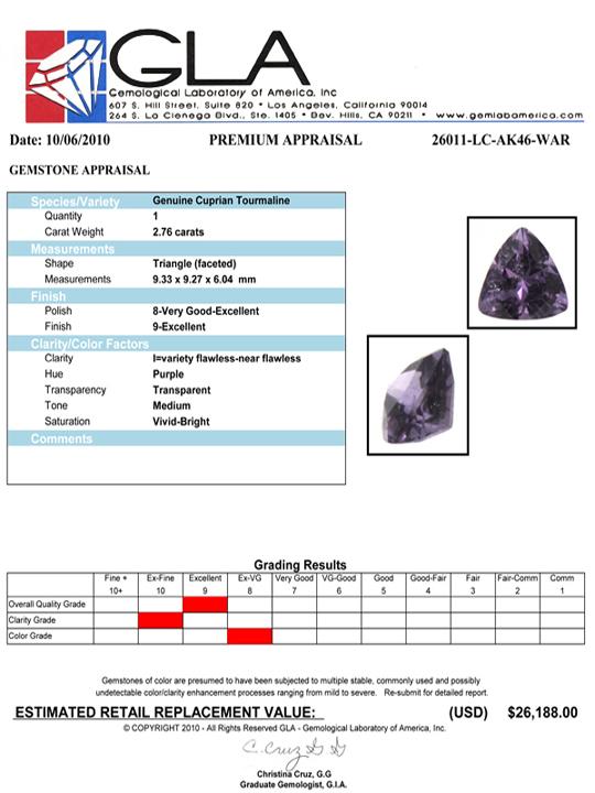 Excellent purple color RARE copper-bearing specimen trillion cut: COPPER in tourmaline is rare and highly prized, it makes the stone color much more vivid (sometimes neon-like) and causes the stone to mimick the reflectivity of diamond; lab quality evalua
