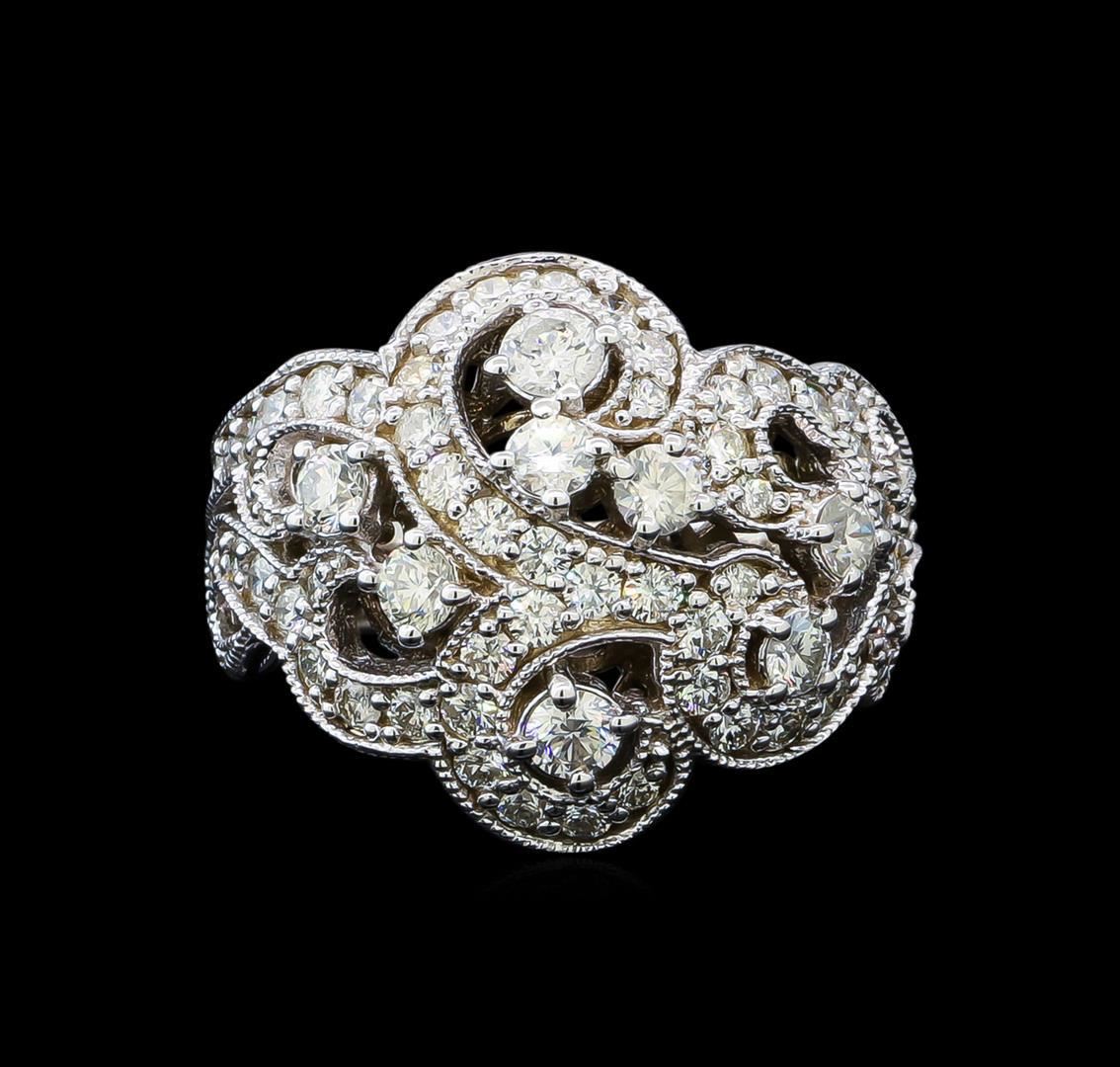 One electronically tested 14KT white gold lady's cast fashion ring with a swirl wide dome with a bright polish with milgrain detailing finish. The featured lady's ring has a shank measuring 3.60 millimeters in width. Identified with markings of "14K". Condition is new, good workmanship. Containing: One prong set round brilliant cut diamond, measuring 3.60 - 3.50 x 2.20mm (depth est.) approximate weight of 0.18ct. Graded in the setting. Clarity: I-1. Color: Good Seven prong set round brilliant cut diamonds, measuring 3.30 - 3.00 x 1.96mm (depth est.) approximate total weight of 7 Stones = 0.81ct. Graded in the setting. Clarity: VS-2 to SI-2. Color: H - I. Cut Good Fifty prong set round brilliant cut diamonds, measuring 2.10 - 2.00 x 1.27mm (depth est.) approximate total weight of 50 Stones = 1.60ct. Graded in the setting. Clarity: SI-1 to SI-2. Color: H - I. Cut Good Eleven prong set round brilliant cut diamonds, measuring 1.60 - 1.50 x 0.96mm (depth est.) approximate total weight of 11 Stones = 0.18ct. Graded in the setting. Clarity: SI-1 to SI-2. Color: H - I. Cut Good. Total Weight of Diamonds 2.77ct. Total Weight of Ring 11.20gm. GAS Appraised.