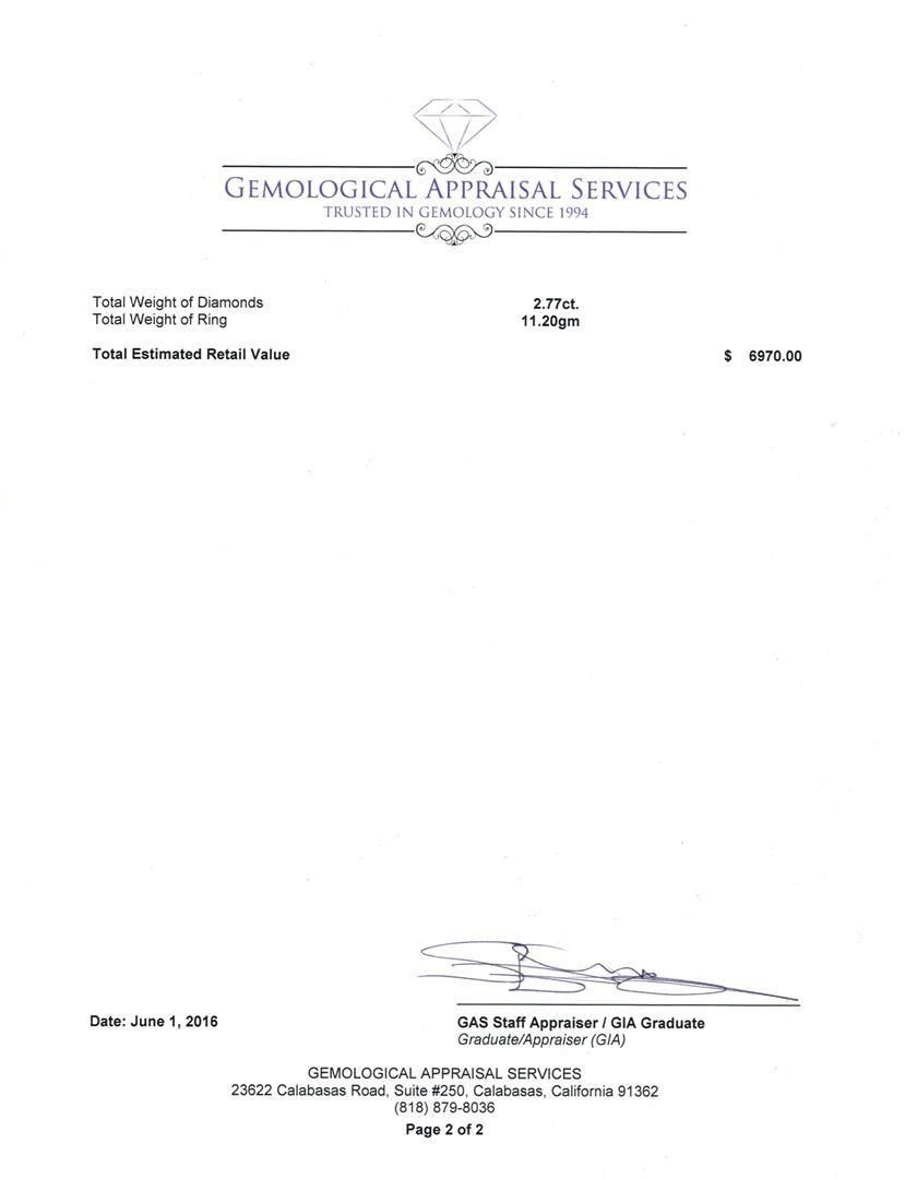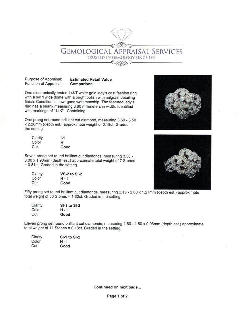 One electronically tested 14KT white gold lady's cast fashion ring with a swirl wide dome with a bright polish with milgrain detailing finish. The featured lady's ring has a shank measuring 3.60 millimeters in width. Identified with markings of "14K". Condition is new, good workmanship. Containing: One prong set round brilliant cut diamond, measuring 3.60 - 3.50 x 2.20mm (depth est.) approximate weight of 0.18ct. Graded in the setting. Clarity: I-1. Color: Good Seven prong set round brilliant cut diamonds, measuring 3.30 - 3.00 x 1.96mm (depth est.) approximate total weight of 7 Stones = 0.81ct. Graded in the setting. Clarity: VS-2 to SI-2. Color: H - I. Cut Good Fifty prong set round brilliant cut diamonds, measuring 2.10 - 2.00 x 1.27mm (depth est.) approximate total weight of 50 Stones = 1.60 ct. Graded in the setting. Clarity: SI-1 to SI-2. Color: H - I. Cut Good Eleven prong set round brilliant cut diamonds, measuring 1.60 - 1.50 x 0.96mm (depth est.) approximate total weight of 11 Stones = 0.18ct. Graded in the setting. Clarity: SI-1 to SI-2. Color: H - I. Cut Good. Total Weight of Diamonds 2.77ct. Total Weight of Ring 11.20gm. GAS Appraised.