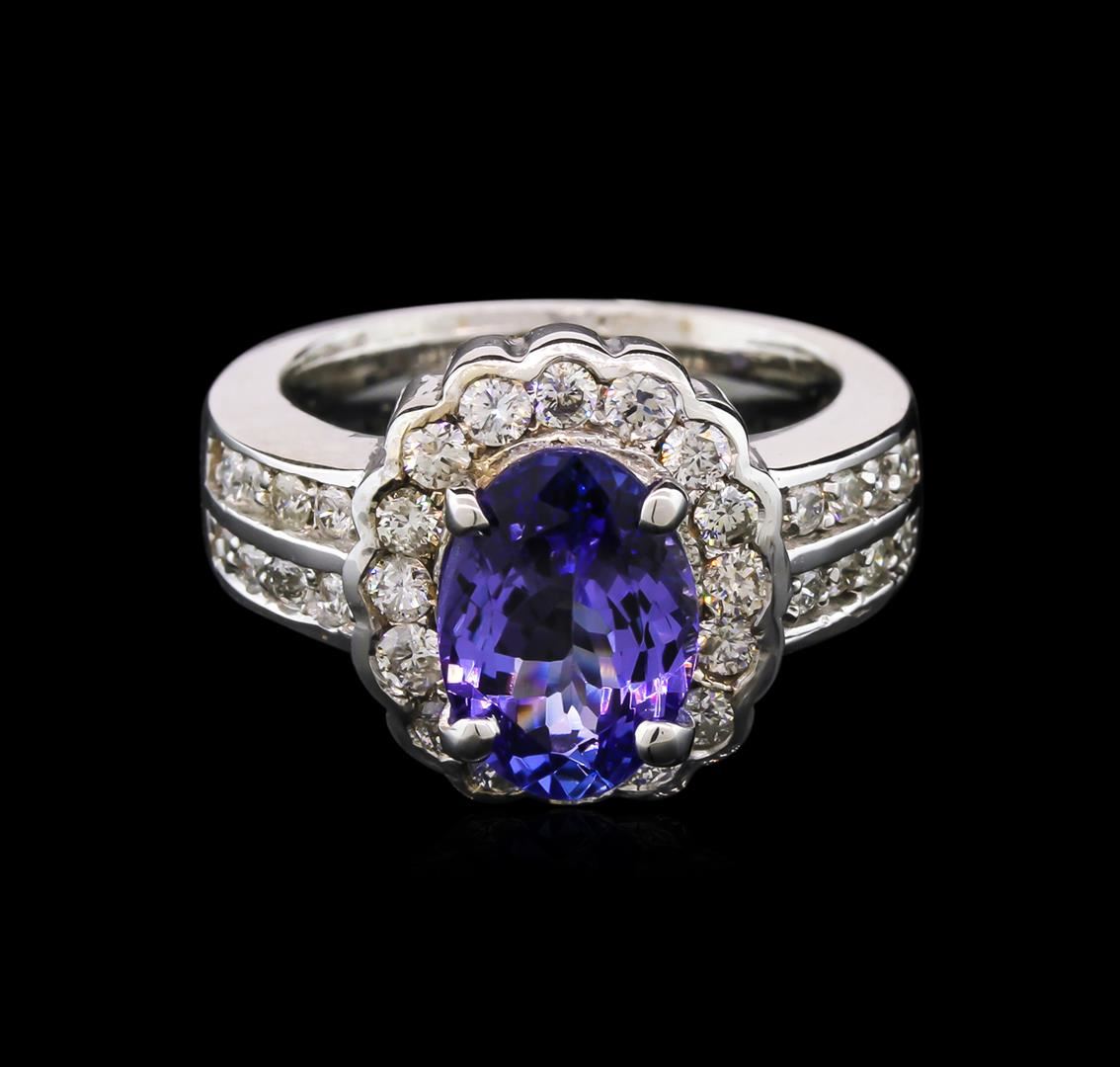 One electronically tested 14KT white gold lady's cast fashion ring with a bright polish finish. The featured lady's ring has a scalloped halo motif and a shank measuring 4.54 millimeters wide. Identified with markings of "14K". Condition is new, good workmanship. Containing: One prong set oval modified brilliant cut natural tanzanite, measuring 10.56 x 7.55 x 4.90mm, approximate weight of 2.77ct., clarity is eye clean, type I, medium, very slightly grayish, bluish violet color, (GIA bV 5/3), cut is very good. Transmitting light with no distortion, transparent. Colored gemstones are presumed to have been subjected to commonly used enhancement processes. Graded in the setting. Sixteen prong set round brilliant cut diamonds, measuring 1.80 - 1.70 x 1.14mm (depth est.) approximate total weight of 16 Stones = 0.34ct. Graded in the setting. Clarity: SI-2 to I-1. Color: H - I. Cut Good Sixteen channel set round brilliant cut diamonds, measuring 2.00 - 1.95 x 1.29mm (depth est.) approximate total weight of 16 Stones = 0.49ct. Graded in the setting. Clarity: SI-2 to I-1. Color: H - I. Cut Good. Total Weight of Colored Stones 2.77ct. Total Weight of Diamonds 0.83ct. Total Weight of Ring 10.30gm. GAS Appraised at $7,795.00.