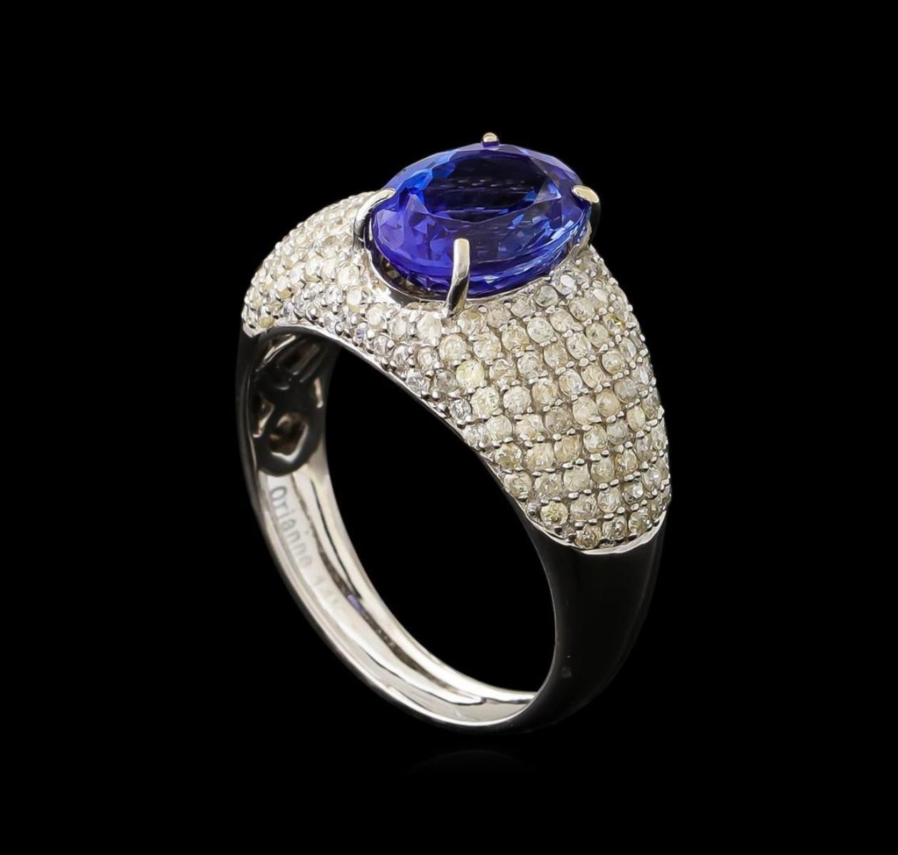 One electronically tested 14KT white gold ladies cast tanzanite and diamond ring with a bright polish finish. The featured tanzanite is set within an elaborate diamond set curvature, completed by a three millimeter wide band. Trademark is Orianne. Identified with markings of "14K". Condition is new, good workmanship. Containing: One prong set oval mixed cut natural tanzanite, measuring 9.65 x 7.55 x 5.20mm, approximate weight of 2.77ct., clarity is eye clean, type I, medium dark, very slightly grayish, bluish violet color, (GIA bV 6/3), cut is good. Transmitting light with no distortion, transparent. Graded in the setting. Tanzanite is a very rare gemstone that is only found in the country of Tanzania. Originally discovered in 1967. Tiffany & Company, named the stone Tanzanite. It is found in the Usumburu Mountains that border the Umba Valley of northern Tanzania. Tanzanite occurs in gray, brown, violet, blue, reddish-purple, & green. The gem is interesting because of its exceptional pleochroism. Rotated in different directions a tanzanite will exhibit multiple changes of color. Tanzanite has a low tolerance to ultrasonic cleaning, and should not be cleaned using this method. One Hundred Eighty-Two prong set round brilliant cut diamonds approximate total weight of 182 Stones = 1.14ct. Graded in the setting. Clarity: I-2 to I-3. Color: I - K. Total Weight of Colored Stones 2.77ct. Total Weight of Diamonds 1.14ct. Total Weight of Ring 3.72gm.