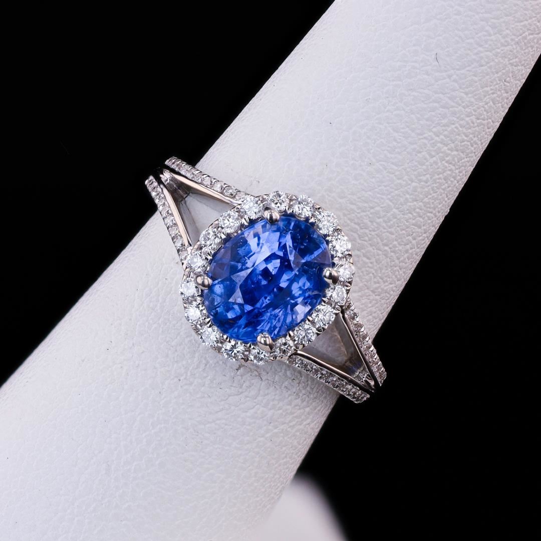 Eighteen karat (18K) white gold natural unheated sapphire corundum and diamond ring. An oval modified brilliant cut natural unheated sapphire corundum gemstone is mounted in the center of the ring. Round brilliant cut diamonds accent the ring on both sides of the center gemstone. The ring has a gross weight of 5.5 Grams. Reference: GIA Sapphire Report 2231552110 #NATURAL GEMSTONE# GEMSTONE: Sapphire Corundum; NATURE: Natural (No Indications of Heating); SHAPE: Oval Modified Brilliant, Faceted Cut; WEIGHT: 2.77 carat total; DIMENSIONS: 8.89 x 7.03 x 5.63mm; CLARITY: Type 3; COLOR: Blue (5/5); SYMMETRY: Excellent; COLOR INTENSITY: Intense; TRANSPARENCY: Transparent; TONE: Dark #NATURAL DIAMOND# SHAPE: Round Brilliant Cut; WEIGHT: 0.34 carat total (58pcs.); DIMENSIONS: 1.6 x 0.9mm; AVERAGE CLARITY: VS1-VS2; AVERAGE COLOR: F-G; SYMMETRY: Excellent; POLISH: Excellent #METAL# METAL: Gold; PURITY: 18K (750); COLOR: White; CONDITION: Excellent; FINISH: High Polish #Size: 6 3/4