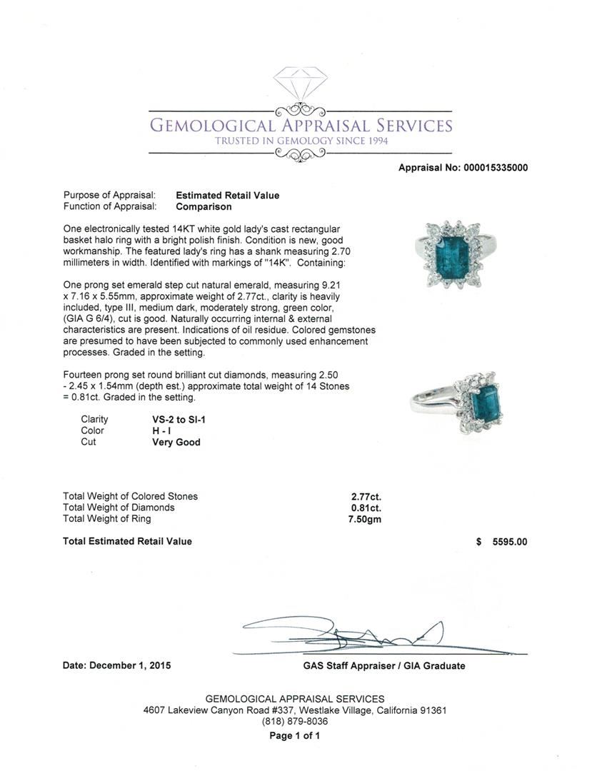 One electronically tested 14KT white gold lady's cast rectangular basket halo ring with a bright polish finish. The featured lady's ring has a shank measuring 2.70 millimeters in width. Identified with markings of "14K". Condition is new, good workmanship. Containing: One prong set emerald step cut natural emerald, measuring 9.21 x 7.16 x 5.55mm, approximate weight of 2.77ct., clarity is heavily included, type III, medium dark, moderately strong, green color, (GIA G 6/4), cut is good. Naturally occurring internal & external characteristics are present. Indications of oil residue. Colored gemstones are presumed to have been subjected to commonly used enhancement processes. Graded in the setting. Fourteen prong set round brilliant cut diamonds, measuring 2.50 - 2.45 x 1.54mm (depth est.) approximate total weight of 14 Stones = 0.81ct. Graded in the setting. Clarity: VS-2 to SI-1 . Color: H - I. Cut Very Good. Total Weight of Colored Stones 2.77ct.. Total Weight of Diamonds 0.81ct.. Total Weight of Ring 7.50gm at $ 5595.00 GAS Appraised.