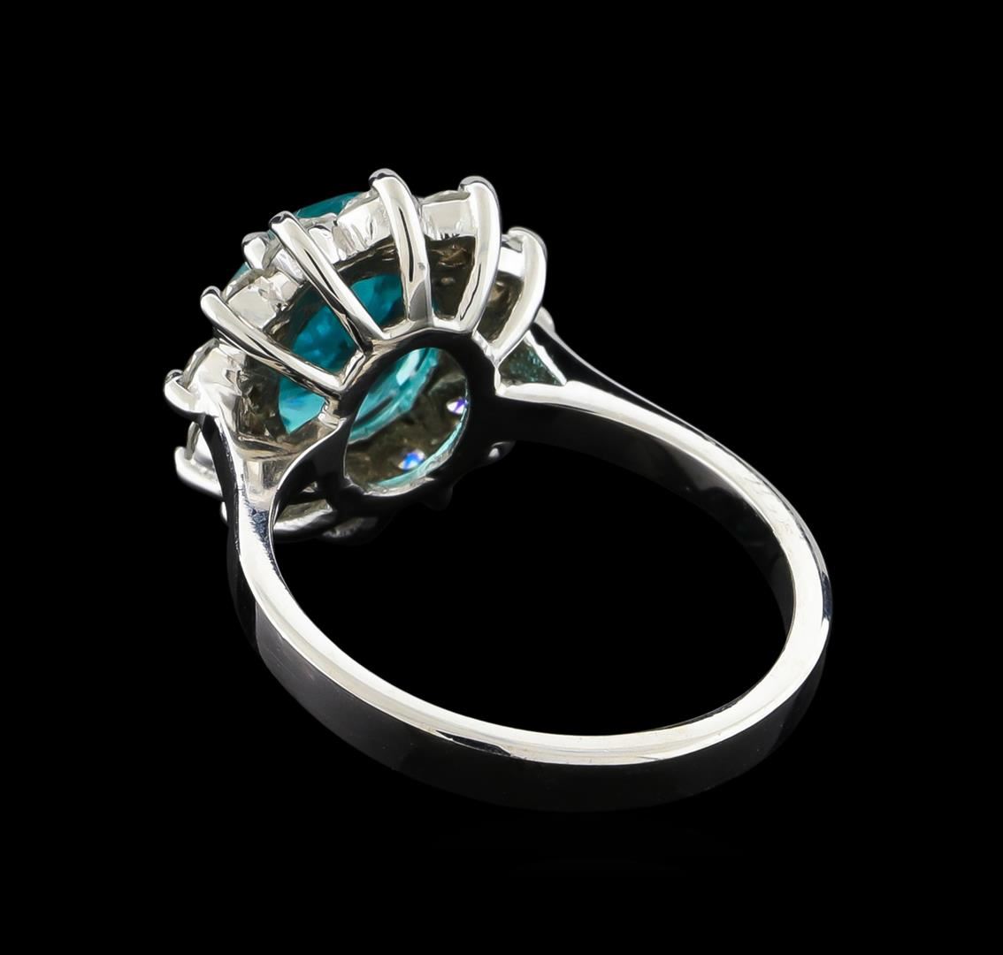 One electronically tested 14KT white gold ladies cast apatite and diamond ring with a bright polish finish. The featured apatite is set within a diamond floret bezel, completed by a two and one-half millimeter wide band. Identified with markings of "14K". Condition is new, good workmanship. Containing: One prong set oval mixed cut natural apatite, measuring 9.90 x 8.05 x 4.80mm, 6%. bulge factor, exact weight 2.78ct., clarity is slightly included, medium, very slightly grayish, greenish blue color, (GIA gB 5/3), cut is good. Transmitting light with a minimum of distortion, transparent,. Naturally occurring internal & external characteristics are present. Graded in the setting. Twelve prong set round brilliant cut diamonds, measuring 2.80 - 2.70 x 1.65mm exact total weight 12 Stones = 0.96ct. Graded in the setting. Clarity: SI-2 to I-1. Color: H - J. Total Weight of Colored Stones 2.78ct. Total Weight of Diamonds 0.96ct. Total Weight of Ring 4.97gm. AIG Appraised at $4,000.00.