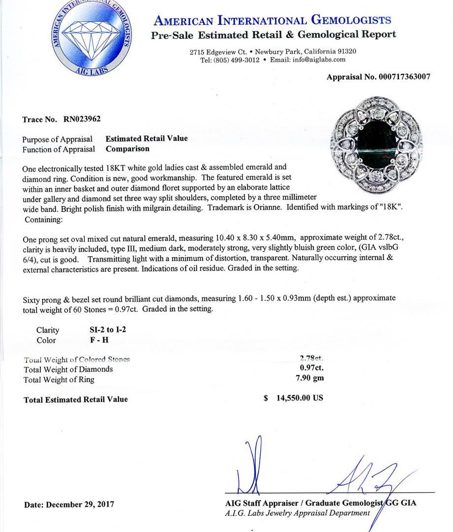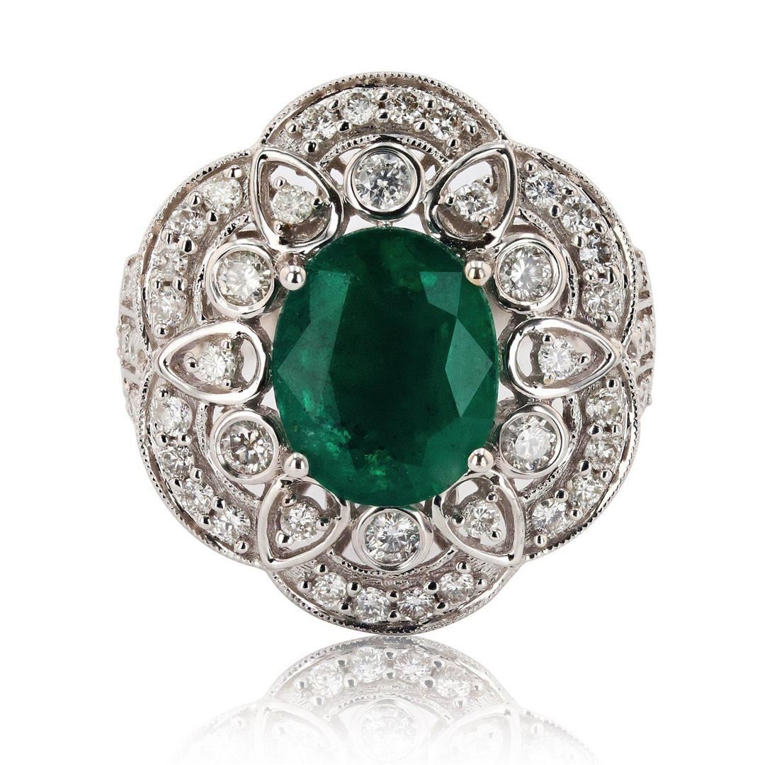 One electronically tested 18KT white gold ladies cast and assembled emerald and diamond ring. Condition is new, good workmanship. The featured emerald is set within an inner basket and outer diamond floret supported by an elaborate lattice under gallery a
