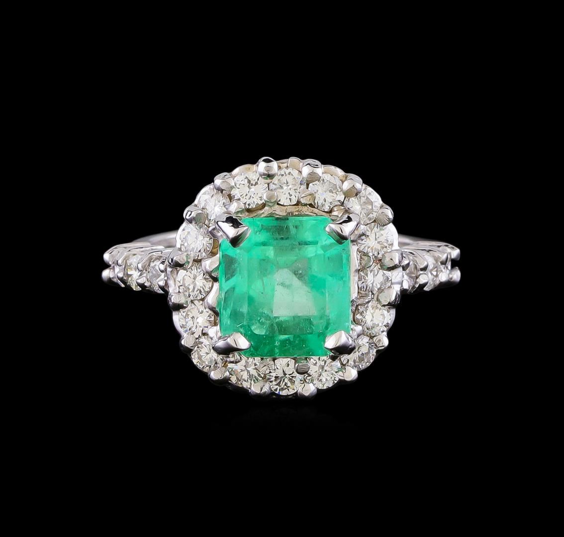 One electronically tested 14KT white gold lady's cast fashion ring with a basket halo with a bright polish finish. The featured lady's has a shank measuring 2.20 millimeters in width. Identified with markings of "14K". Condition is new, good workmanship. Containing: One prong set emerald step cut natural emerald, measuring 8.67 x 8.07 x 6.38mm, (depth est.) approximate weight of 2.78ct., clarity is moderately included, medium light, moderately strong, green color, (GIA G 4/4), cut is good. Transmitting light somewhat diffusely, transparent to translucent. Indications of oil residue. Naturally occurring internal & external characteristics are present. Colored gemstones are presumed to have been subjected to commonly used enhancement processes. Graded in the setting. Twenty-Two prong set round brilliant cut diamonds, measuring 2.35 - 2.25 x 1.44mm (depth est.) approximate total weight of 22 Stones = 1.04ct. Graded in the setting. Clarity: SI-1 to SI-2. Color: H - I. Cut Good. Total Weight of Colored Stones 2.78ct. Total Weight of Diamonds 1.04ct. Total Weight of Ring 7.00gm. GAS Appraised.