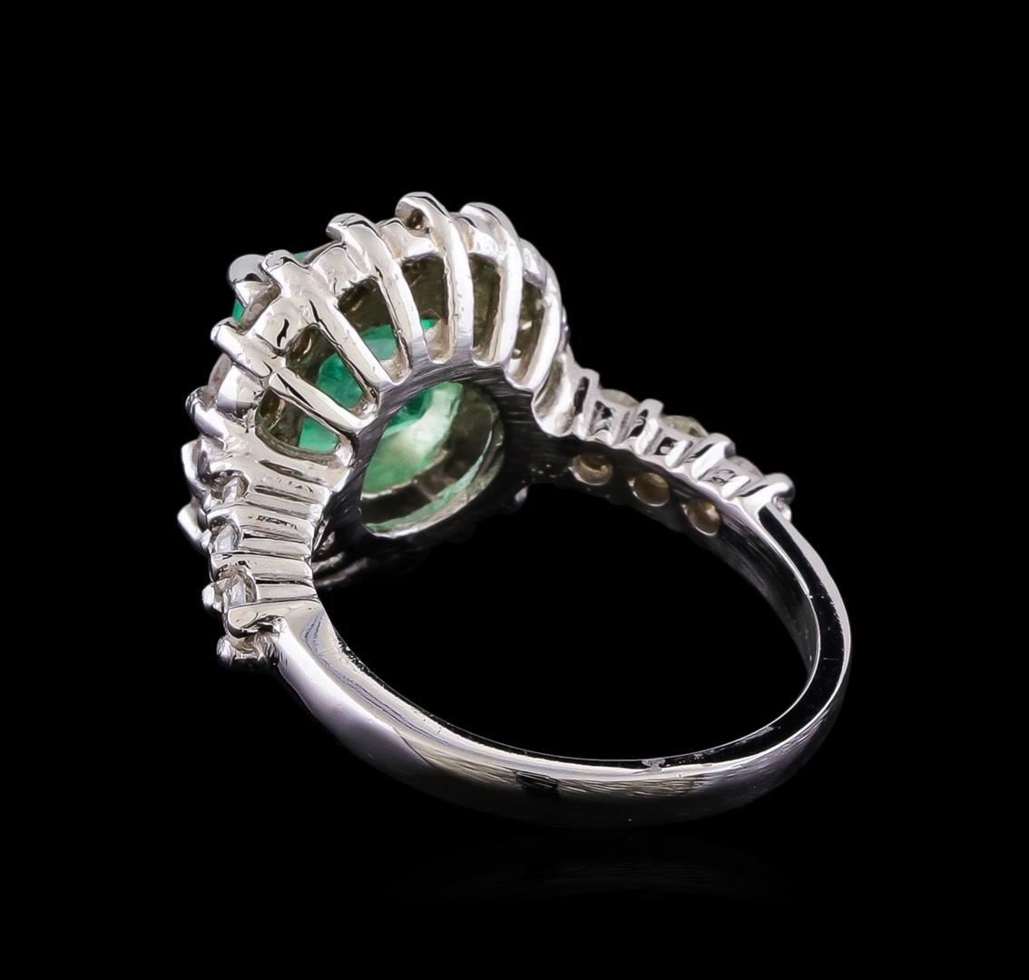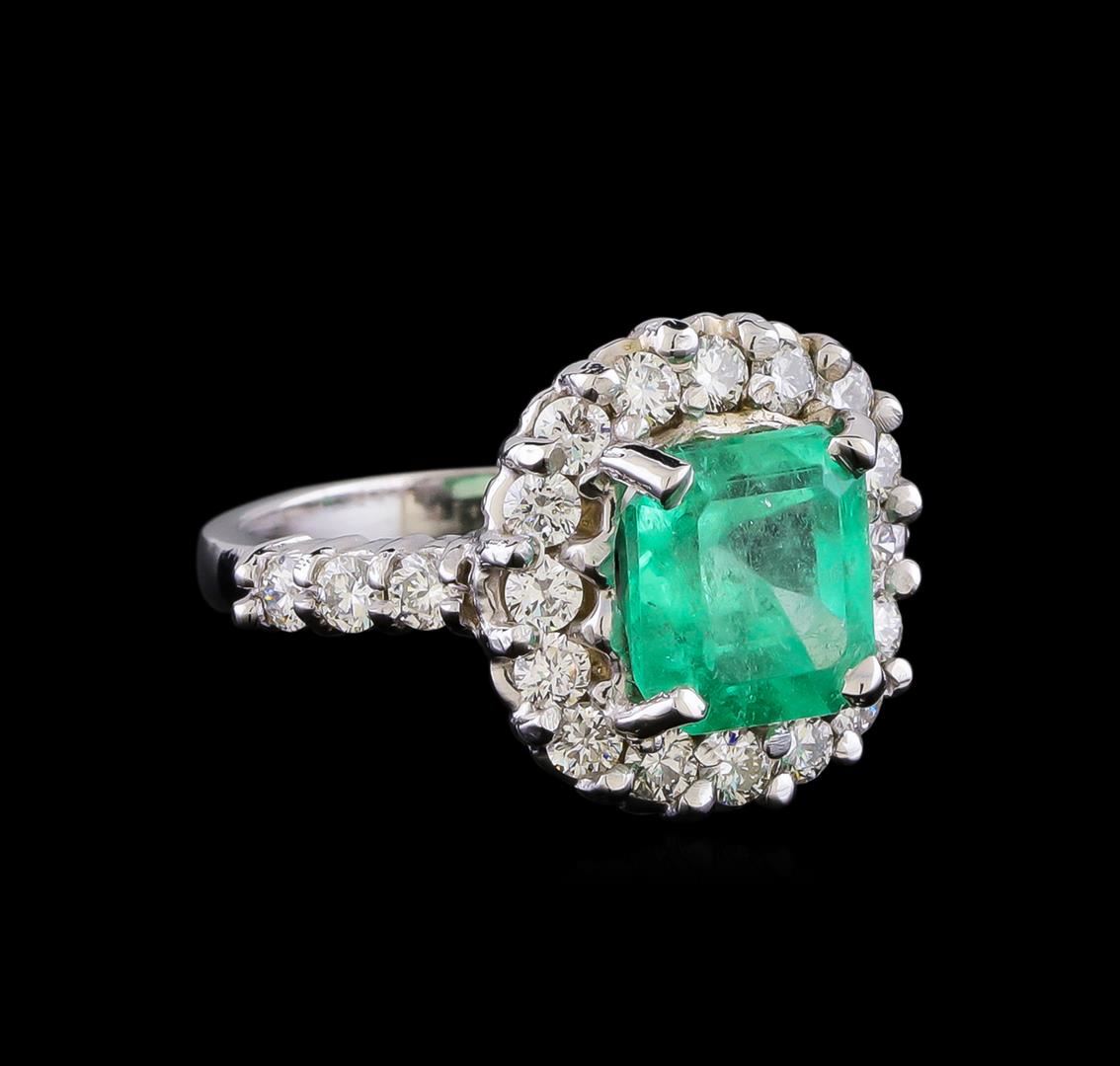 One electronically tested 14KT white gold lady's cast fashion ring with a basket halo with a bright polish finish. The featured lady's has a shank measuring 2.20 millimeters in width. Identified with markings of "14K". Condition is new, good workmanship. Containing: One prong set emerald step cut natural emerald, measuring 8.67 x 8.07 x 6.38mm, (depth est.) approximate weight of 2.78ct., clarity is moderately included, medium light, moderately strong, green color, (GIA G 4/4), cut is good. Transmitting light somewhat diffusely, transparent to translucent. Indications of oil residue. Naturally occurring internal & external characteristics are present. Colored gemstones are presumed to have been subjected to commonly used enhancement processes. Graded in the setting. Twenty-Two prong set round brilliant cut diamonds, measuring 2.35 - 2.25 x 1.44mm (depth est.) approximate total weight of 22 Stones = 1.04ct. Graded in the setting. Clarity: SI-1 to SI-2. Color: H - I. Cut Good. Total Weight of Colored Stones 2.78ct. Total Weight of Diamonds 1.04ct. Total Weight of Ring 7.00gm. GAS Appraised.