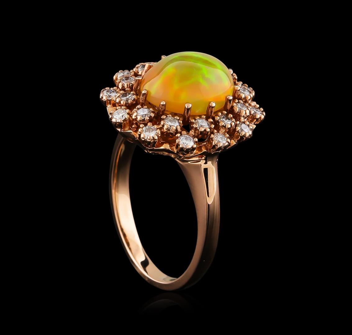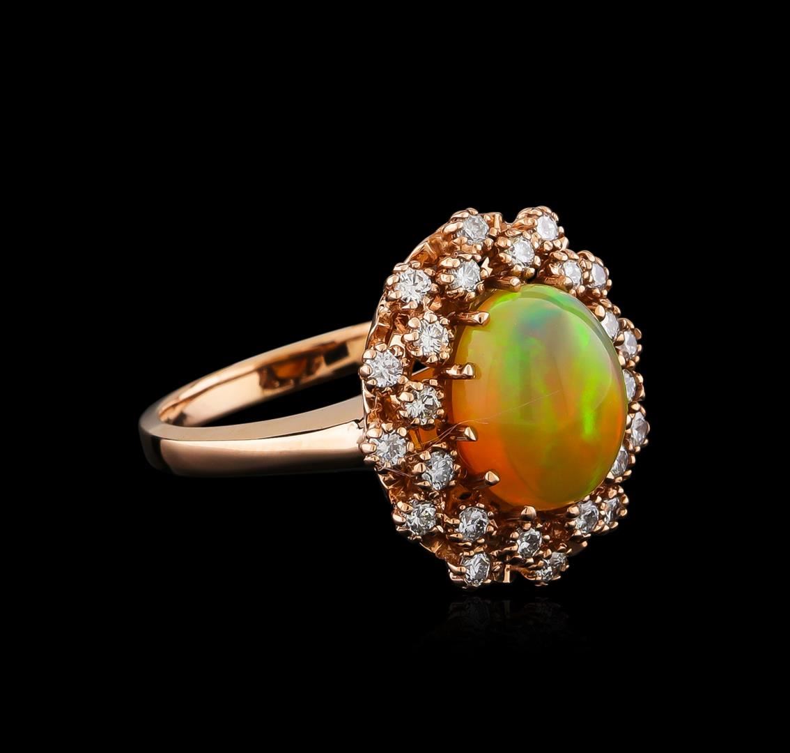 One electronically tested 14KT rose gold lady's cast fashion ring with a double basket halo with a bright polish finish. The featured lady's ring has a shank measuring 2.22 millimeters wide. Identified with markings of "K14". Condition is new, good workmanship. Containing: One orange crystal that is cut in a oval shaped cabochon and is prong set, measuring 10.70 mm long x 9.40 mm wide, and 5.42 mm thick and the approximate weight is 2.78 carats. The opal has a bright, orange-green play of color (fire) in a rolling flashfire pattern; a medium dome; a good cut; no inclusions; consistent in its brightness and pattern; and is not directional. Graded in the setting. Twenty-Four prong set round brilliant cut diamonds, measuring 1.95 - 1.85 x 1.18mm (depth est.) approximate total weight of 24 Stones = 0.62ct. Graded in the setting. Clarity: SI-1 to SI-2. Color: G - Very Good. Total Weight of Diamonds 0.62ct. Total Weight of Opals 2.78ct. Total Weight of Ring 7.70gm. GAS Appraised at $3,485.00.