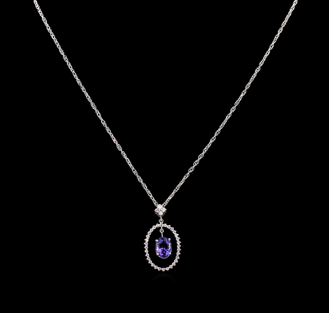 One electronically tested 14KT white gold lady's combination cast & assembled dangle pendant & chain 18.0" long, 1.1mm diamond cut fancy link with a spring ring clasp with a bright polish finish. Identified with markings of "14K". Condition is new, good workmanship. Containing: One prong set oval modified brilliant cut natural tanzanite, measuring 9.45 x 7.35 x 5.65mm, approximate weight of 2.78ct., clarity is eye clean, type I, medium, very slightly grayish, bluish violet color, (GIA bV 5/3), cut is good. Transmitting light with no distortion, transparent. Colored gemstones are presumed to have been subjected to commonly used enhancement processes. Graded in the setting. Four prong set round brilliant cut diamonds, measuring 1.80 - 1.70 x 1.05mm (depth est.) approximate total weight of 4 Stones = 0.08ct. Graded in the setting. Clarity: SI-2 to I-1. Color: H - I. Cut Good Thirty-Two prong set round brilliant cut diamonds, measuring 1.40 - 1.30 x 0.84mm (depth est.) approximate total weight of 32 Stones = 0.30ct. Graded in the setting. Clarity: SI-2 to I-1. Color: H - I. Cut Good. Total Weight of Colored Stones 2.78ct. Total Weight of Diamonds 0.38ct. Total Weight of Pendant & Chain 5.30gm. GAS Appraised at $5,245.00.