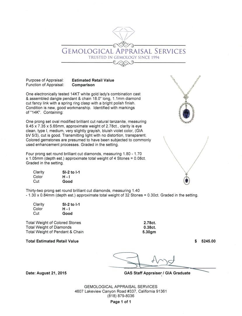 One electronically tested 14KT white gold lady's combination cast & assembled dangle pendant & chain 18.0" long, 1.1mm diamond cut fancy link with a spring ring clasp with a bright polish finish. Identified with markings of "14K". Condition is new, good workmanship. Containing: One prong set oval modified brilliant cut natural tanzanite, measuring 9.45 x 7.35 x 5.65mm, approximate weight of 2.78ct., clarity is eye clean, type I, medium, very slightly grayish, bluish violet color, (GIA bV 5/3), cut is good. Transmitting light with no distortion, transparent. Colored gemstones are presumed to have been subjected to commonly used enhancement processes. Graded in the setting. Four prong set round brilliant cut diamonds, measuring 1.80 - 1.70 x 1.05mm (depth est.) approximate total weight of 4 Stones = 0.08ct. Graded in the setting. Clarity: SI-2 to I-1. Color: H - I. Cut Good Thirty-Two prong set round brilliant cut diamonds, measuring 1.40 - 1.30 x 0.84mm (depth est.) approximate total weight of 32 Stones = 0.30ct. Graded in the setting. Clarity: SI-2 to I-1. Color: H - I. Cut Good. Total Weight of Colored Stones 2.78ct. Total Weight of Diamonds 0.38ct. Total Weight of Pendant & Chain 5.30gm. GAS Appraised at $5,245.00.