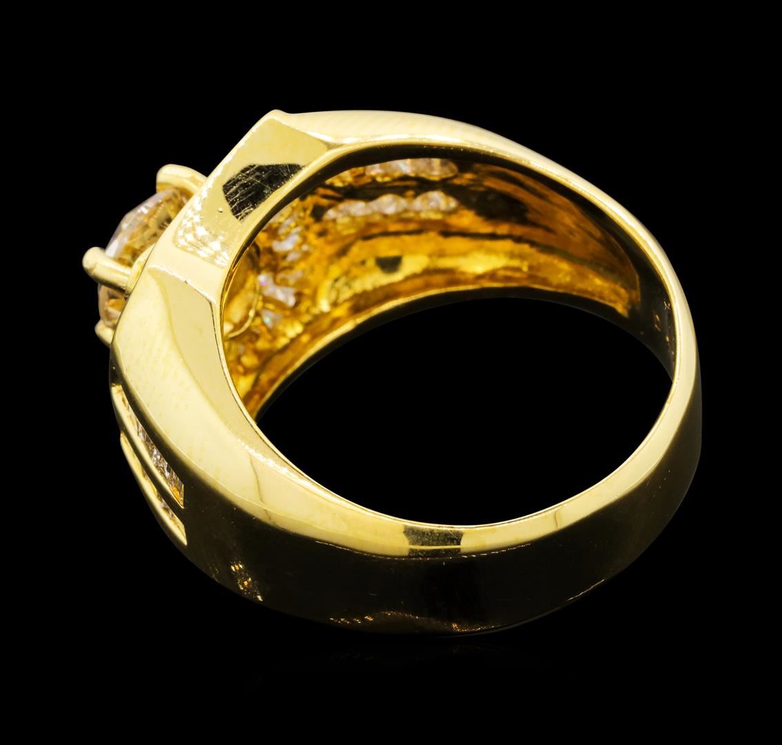One electronically tested 18KT yellow gold lady's cast wedding ring with a tapered wide band with a bright polish finish. The featured lady's ring has a shank measuring 6.50 millimeters wide. Condition is new, good workmanship. Containing: One prong set round brilliant cut diamond, measuring 7.12 - 7.01 x 4.66mm (depth est.) approximate weight of 1.49ct. Graded loose prior to setting in the GIA Laboratory, Report #1172859551. Color U - V Clarity I-1 Cut Good Twenty channel set baguette cut diamonds, measuring from 1.90 x 1.35 x 1.15mm (depth est.) to 2.10 x 1.40 x 1.19mm (depth est.) approximate total weight of 20 Stones = 0.60ct. Graded in the setting. Color H - I Clarity VS-1 to VS-2 Cut Very Good Thirty-Five channel set baguette cut (tapered) diamonds, measuring from 1.80 x 1.10 x 0.94mm (depth est.) to 2.10 x 1.20 x 1.02mm (depth est.) approximate total weight of 35 Stones = 0.70ct. Graded in the setting. Color H - I Clarity VS-1 to VS-2 Cut Very Good. Total Weight of Diamonds 2.79ct.. Total Weight of Ring 11.70gm GAS Appraised at $14,430.00.