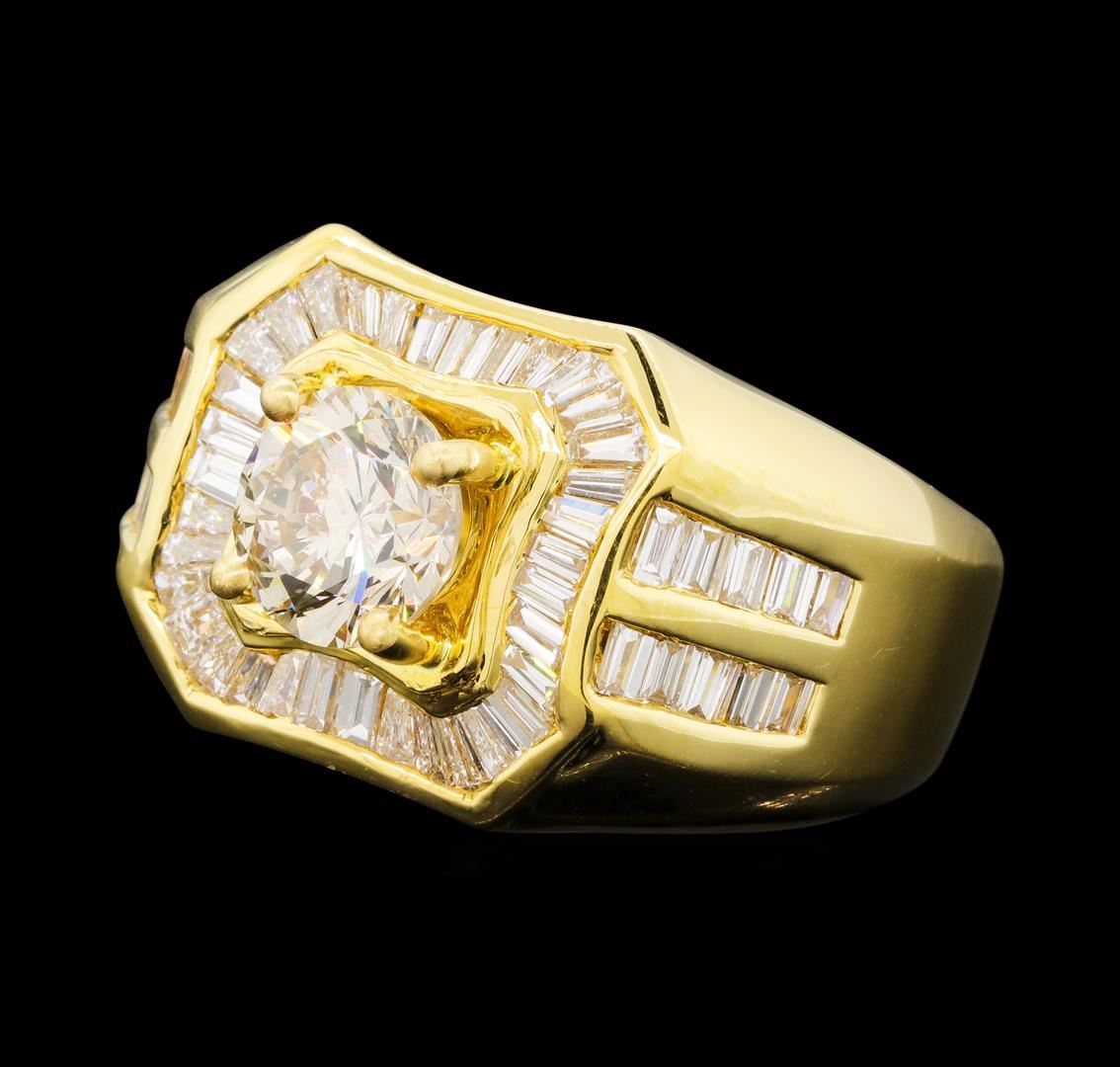 One electronically tested 18KT yellow gold lady's cast wedding ring with a tapered wide band with a bright polish finish. The featured lady's ring has a shank measuring 6.50 millimeters wide. Condition is new, good workmanship. Containing: One prong set round brilliant cut diamond, measuring 7.12 - 7.01 x 4.66mm (depth est.) approximate weight of 1.49ct. Graded loose prior to setting in the GIA Laboratory, Report #1172859551. Color U - V Clarity I-1 Cut Good Twenty channel set baguette cut diamonds, measuring from 1.90 x 1.35 x 1.15mm (depth est.) to 2.10 x 1.40 x 1.19mm (depth est.) approximate total weight of 20 Stones = 0.60ct. Graded in the setting. Color H - I Clarity VS-1 to VS-2 Cut Very Good Thirty-Five channel set baguette cut (tapered) diamonds, measuring from 1.80 x 1.10 x 0.94mm (depth est.) to 2.10 x 1.20 x 1.02mm (depth est.) approximate total weight of 35 Stones = 0.70ct. Graded in the setting. Color H - I Clarity VS-1 to VS-2 Cut Very Good. Total Weight of Diamonds 2.79ct.. Total Weight of Ring 11.70gm GAS Appraised at $14,430.00.