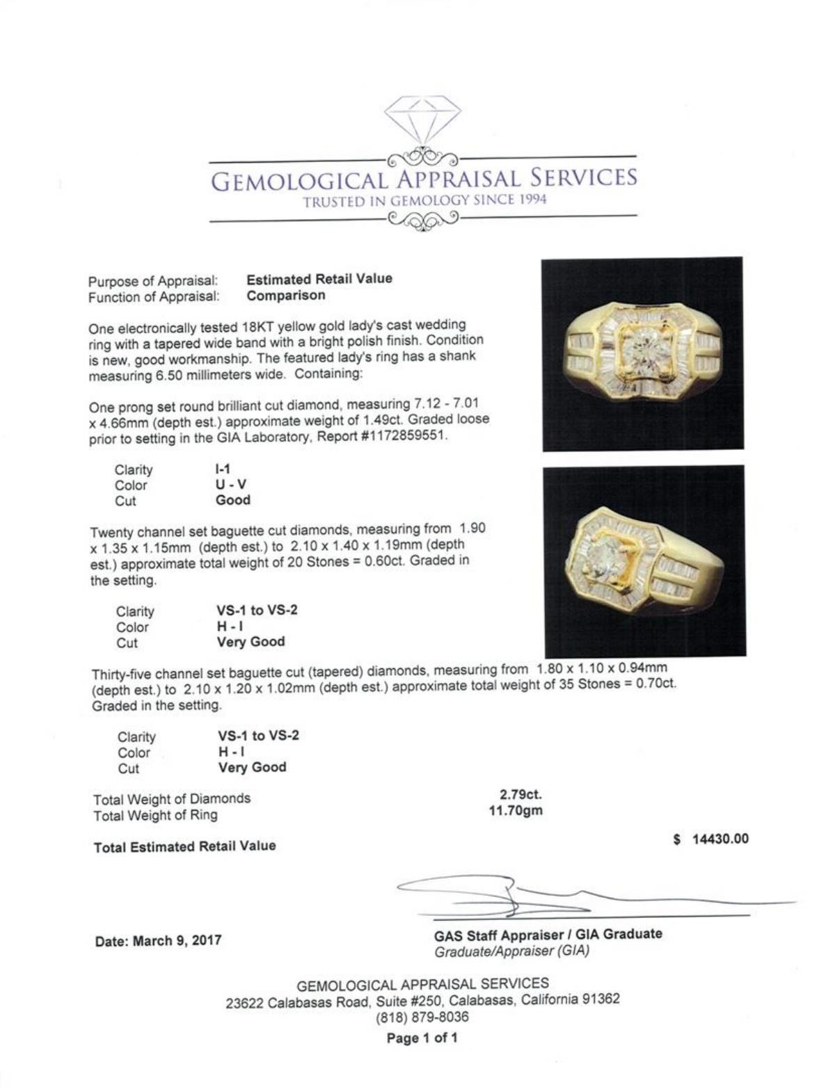 One electronically tested 18KT yellow gold lady's cast wedding ring with a tapered wide band with a bright polish finish. The featured lady's ring has a shank measuring 6.50 millimeters wide. Condition is new, good workmanship. Containing: One prong set round brilliant cut diamond, measuring 7.12 - 7.01 x 4.66mm (depth est.) approximate weight of 1.49ct. Graded loose prior to setting in the GIA Laboratory, Report #1172859551. Color U - V Clarity I-1 Cut Good Twenty channel set baguette cut diamonds, measuring from 1.90 x 1.35 x 1.15mm (depth est.) to 2.10 x 1.40 x 1.19mm (depth est.) approximate total weight of 20 Stones = 0.60ct. Graded in the setting. Color H - I Clarity VS-1 to VS-2 Cut Very Good Thirty-Five channel set baguette cut (tapered) diamonds, measuring from 1.80 x 1.10 x 0.94mm (depth est.) to 2.10 x 1.20 x 1.02mm (depth est.) approximate total weight of 35 Stones = 0.70ct. Graded in the setting. Color H - I Clarity VS-1 to VS-2 Cut Very Good. Total Weight of Diamonds 2.79ct.. Total Weight of Ring 11.70gm GAS Appraised.