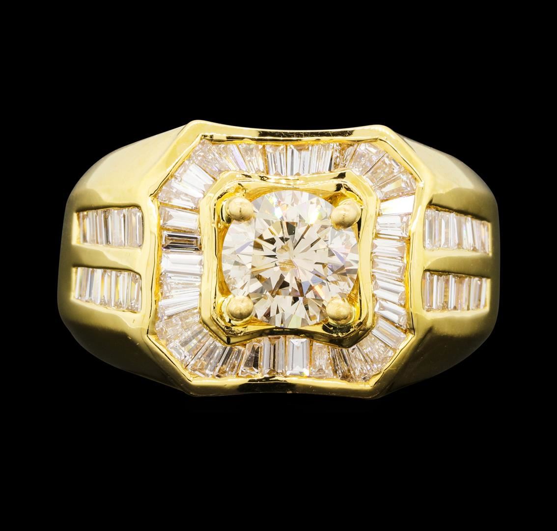 One electronically tested 18KT yellow gold lady's cast wedding ring with a tapered wide band with a bright polish finish. The featured lady's ring has a shank measuring 6.50 millimeters wide. Condition is new, good workmanship. Containing: One prong set round brilliant cut diamond, measuring 7.12 - 7.01 x 4.66mm (depth est.) approximate weight of 1.49ct. Graded loose prior to setting in the GIA Laboratory, Report #1172859551. Color U - V Clarity I-1 Cut Good Twenty channel set baguette cut diamonds, measuring from 1.90 x 1.35 x 1.15mm (depth est.) to 2.10 x 1.40 x 1.19mm (depth est.) approximate total weight of 20 Stones = 0.60ct. Graded in the setting. Color H - I Clarity VS-1 to VS-2 Cut Very Good Thirty-Five channel set baguette cut (tapered) diamonds, measuring from 1.80 x 1.10 x 0.94mm (depth est.) to 2.10 x 1.20 x 1.02mm (depth est.) approximate total weight of 35 Stones = 0.70ct. Graded in the setting. Color H - I Clarity VS-1 to VS-2 Cut Very Good. Total Weight of Diamonds 2.79ct.. Total Weight of Ring 11.70gm GAS Appraised.