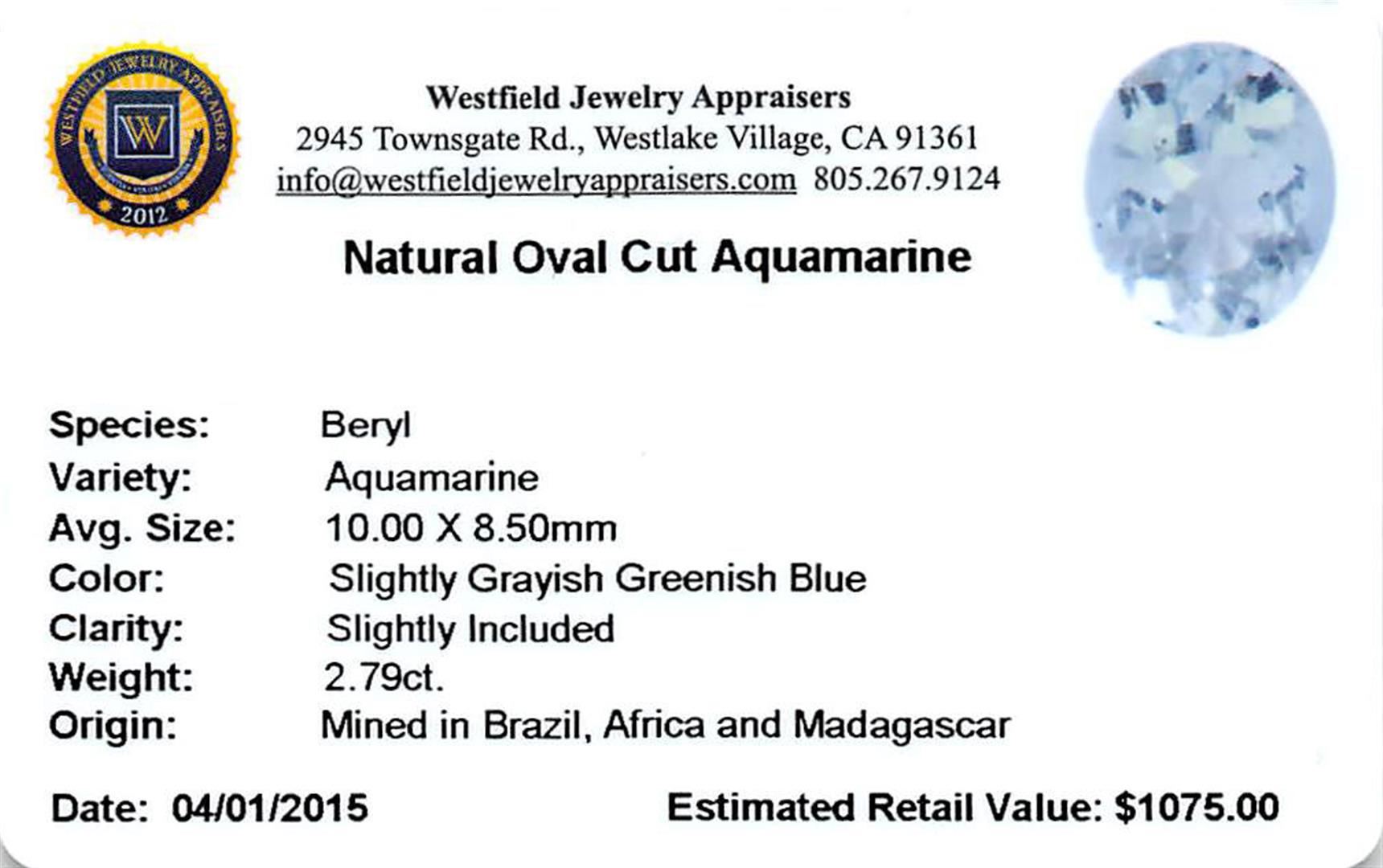 One oval cut natural aquamarine exact weight 2.79ct., clarity is slightly included, type I, medium, very slightly grayish, very slightly greenish blue color, (GIA vslgB 5/3), cut is good. Westfield Appraised at $1,075.00.
