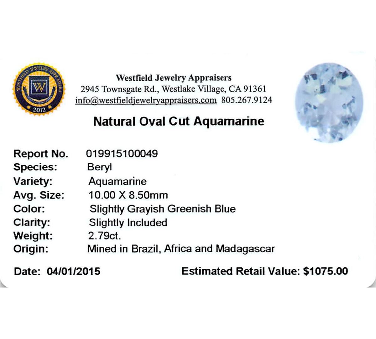 One oval cut natural aquamarine exact weight 2.79ct., clarity is slightly included, type I, medium, very slightly grayish, very slightly greenish blue color, (GIA vslgB 5/3), cut is good. Westfield Appraised at $1,075.00.