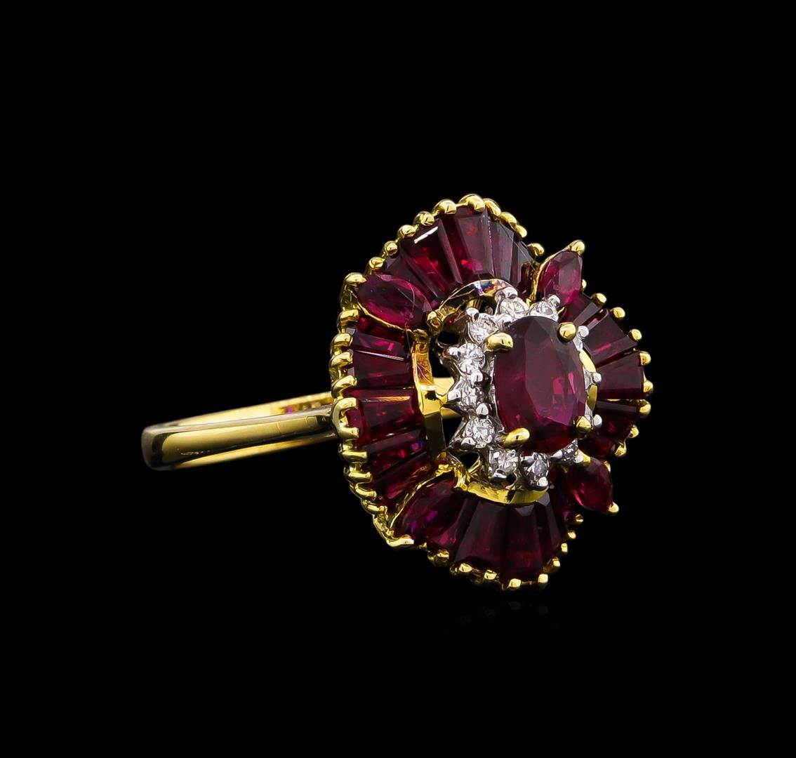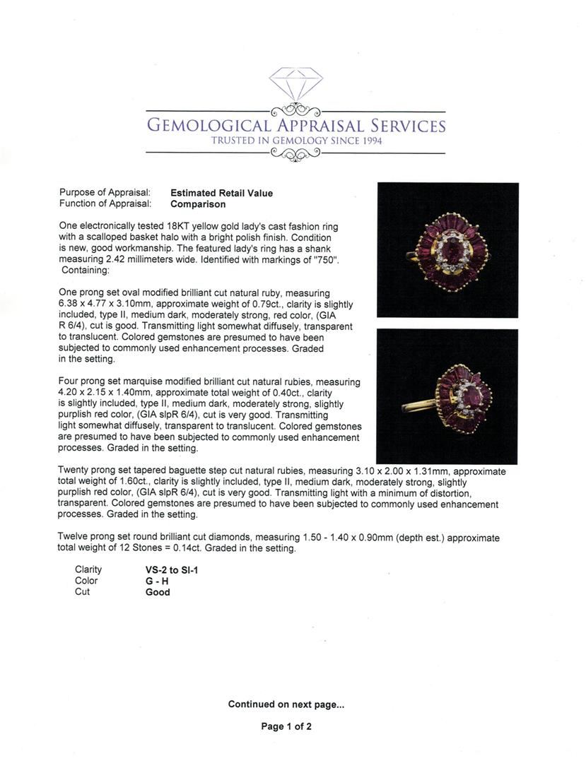 One electronically tested 18KT yellow gold lady's cast fashion ring with a scalloped basket halo with a bright polish finish. The featured lady's ring has a shank measuring 2.42 millimeters wide. Identified with markings of "750". Condition is new, good workmanship. Containing: One prong set oval modified brilliant cut natural ruby, measuring 6.38 x 4.77 x 3.10mm, approximate weight of 0.79ct., clarity is slightly included, type II, medium dark, moderately strong, red color, (GIA R 6/4), cut is good. Transmitting light somewhat diffusely, transparent to translucent. Colored gemstones are presumed to have been subjected to commonly used enhancement processes. Graded in the setting. Four prong set marquise modified brilliant cut natural rubies, measuring 4.20 x 2.15 x 1.40mm, approximate total weight of 0.40ct., clarity is slightly included, type II, medium dark, moderately strong, slightly purplish red color, (GIA slpR 6/4), cut is very good. Transmitting light somewhat diffusely, transparent to translucent. Colored gemstones are presumed to have been subjected to commonly used enhancement processes. Graded in the setting. Twenty prong set tapered baguette step cut natural rubies, measuring 3.10 x 2.00 x 1.31mm, approximate total weight of 1.60ct., clarity is slightly included, type II, medium dark, moderately strong, slightly purplish red color, (GIA slpR 6/4), cut is very good. Transmitting light with a minimum of distortion, transparent. Colored gemstones are presumed to have been subjected to commonly used enhancement processes. Graded in the setting. Twelve prong set round brilliant cut diamonds, measuring 1.50 - 1.40 x 0.90mm (depth est.) approximate total weight of 12 Stones = 0.14ct. Graded in the setting. Clarity: VS-2 to SI-1. Color: G - Good. Total Weight of Colored Stones 2.79ct. Total Weight of Diamonds 0.14ct. Total Weight of Ring 6.10gm. GAS Appraised at $5,055.00.
