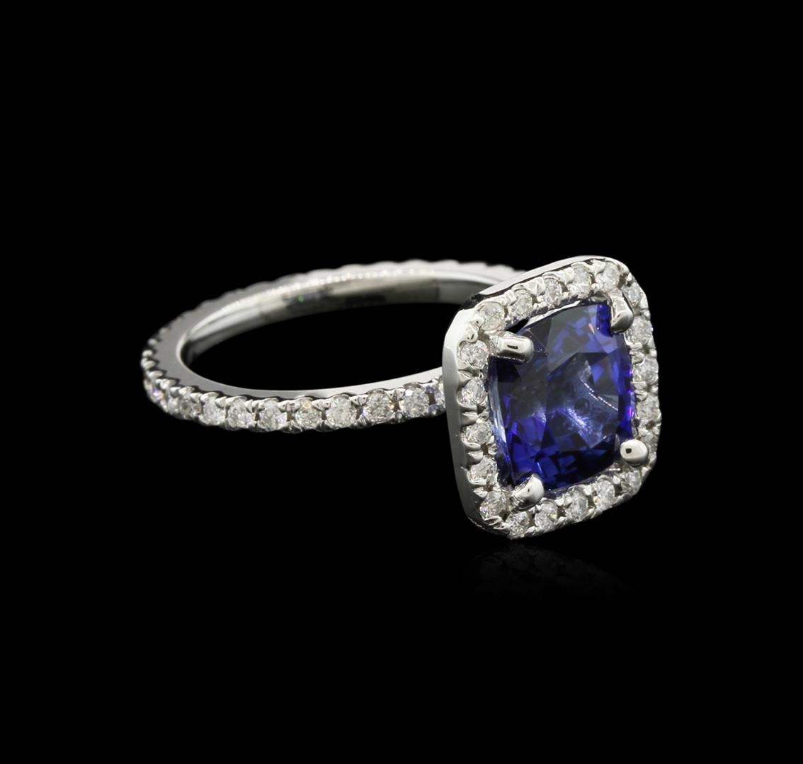 One electronically tested 14KT white gold ladies cast sapphire and diamond ring with a bright polish finish. The featured sapphire is set within a diamond bezel supported by a diamond accented under gallery and diamond set shoulders, completed by a continuous one and one-half millimeter wide diamond set band. Ring size 5.75. Condition is new, good workmanship. Containing: One prong set square cushion mixed cut natural blue sapphire, measuring 7.70 x 7.60 x 4.85mm, 6% bulge factor, exact weight 2.80ct., clarity is eye clean, type II, dark, moderately strong, blue color, (GIA B 7/4), cut is good. Transmitting light with no distortion, transparent. Indications of laboratory high temperature diffusion treatment. Graded in the setting. Sixty-Eight prong set round brilliant cut diamonds exact total weight 68 Stones = 0.68ct. Graded in the setting. Clarity: SI-2 to I-1. Color: G - I. Total Weight of Colored Stones 2.80ct. Total Weight of Diamonds 0.68ct. Total Weight of Ring 3.53gm. AIG Appraised at $4,370.00.