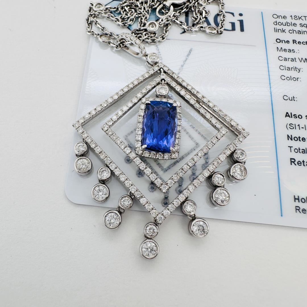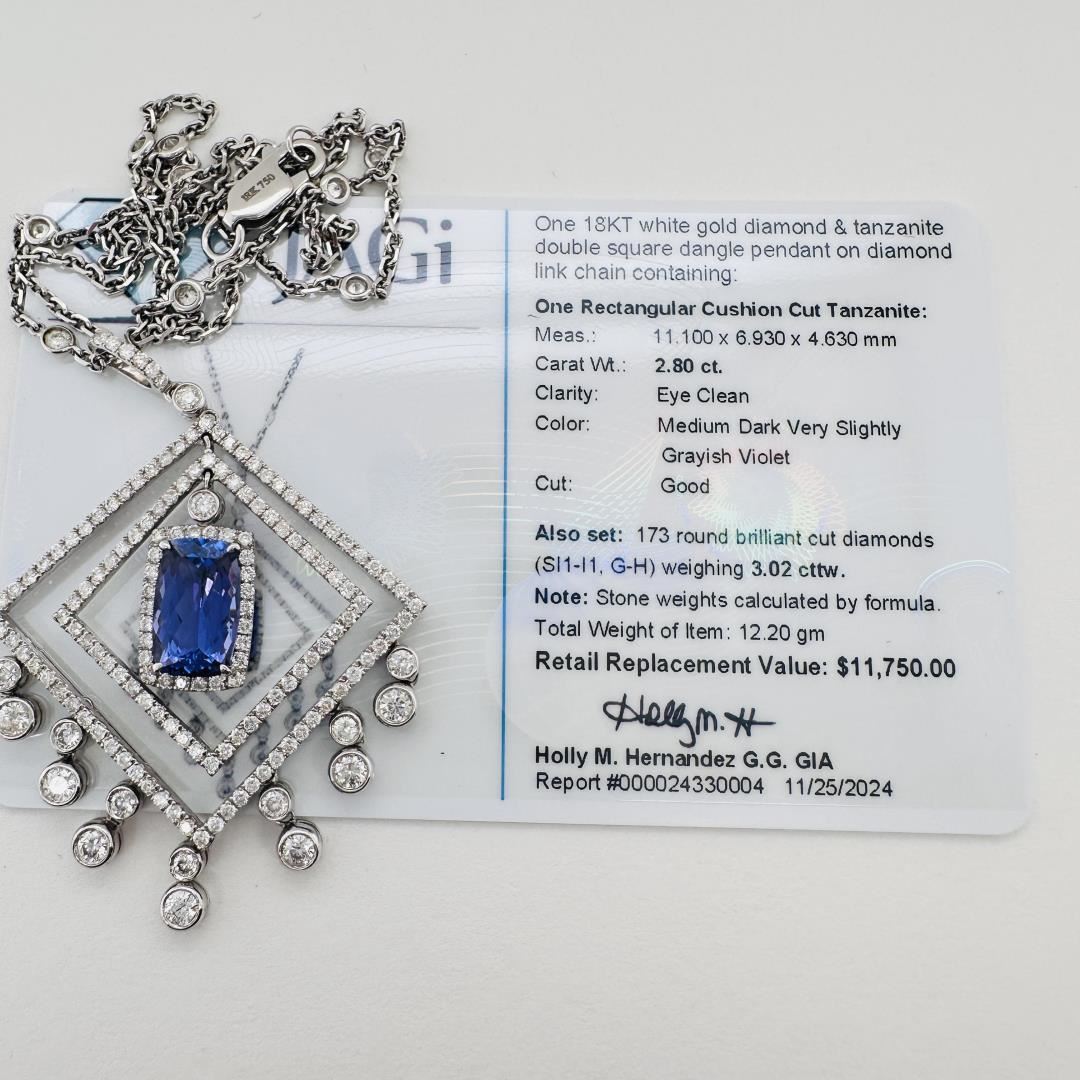 This elegant 18K white gold double square dangle pendant on a diamond link chain features one rectangular cushion cut tanzanite measuring 11.100 x 6.930 x 4.630 mm, weighing 2.80 ct, with eye clean clarity and medium dark very slightly grayish violet color, exhibiting a Good cut. Also set are 173 round brilliant cut diamonds weighing 3.02 cttw, with SI1-I1 clarity and G-H color. The total item weight is 12.20 gm.