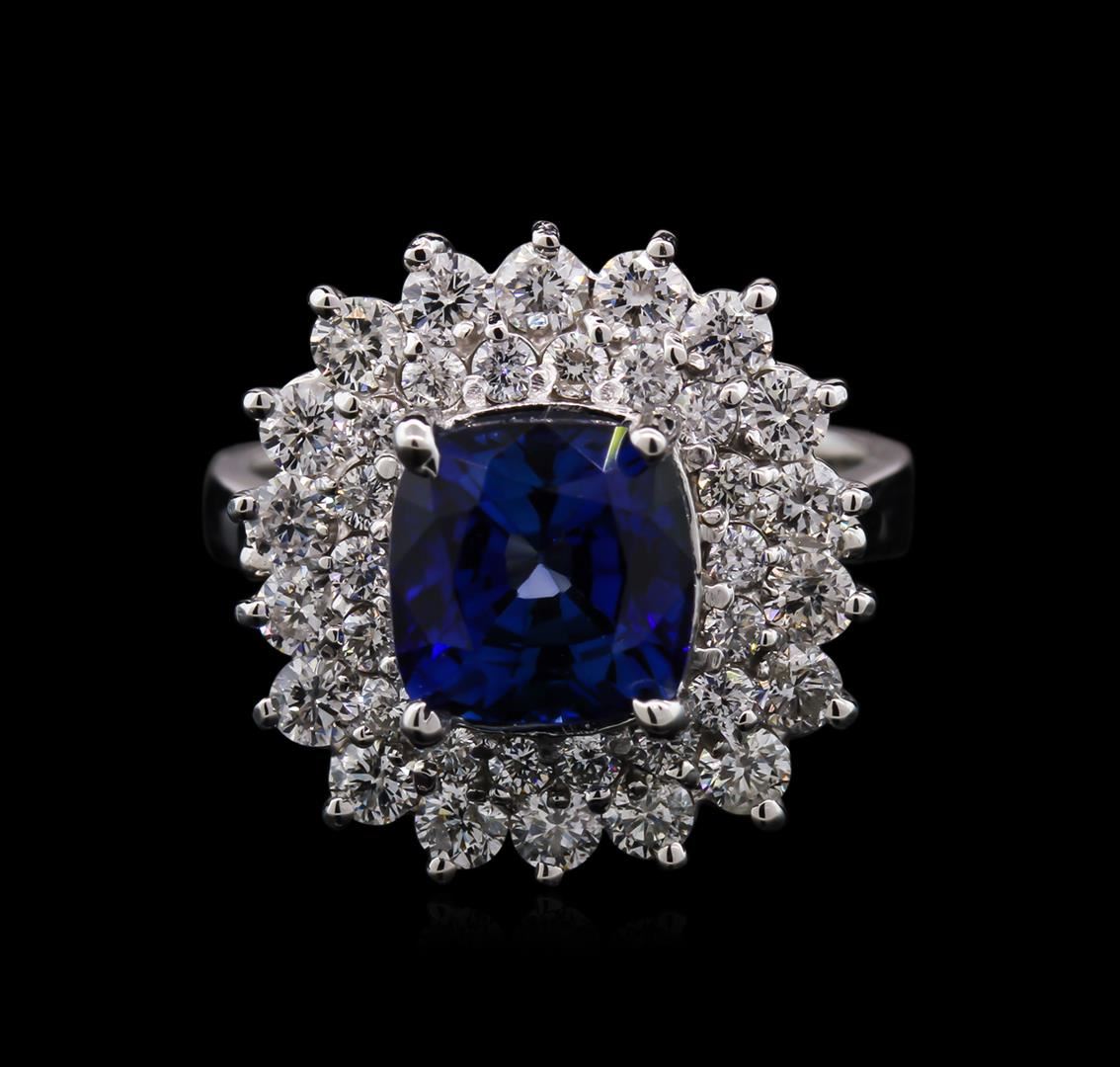 One electronically tested 14KT white gold lady's cast fashion ring with a basket double halo with a bright polish finish. The featured ladies ring has a shank measuring 2.90 millimeters in width. Identified with markings of "K14". Condition is new, good workmanship. Containing: One prong set square cushion modified brilliant cut natural tanzanite, measuring 7.98 x 7.96 x 5.54mm, approximate weight of 2.80ct., clarity is eye clean, type I, medium dark, moderately strong, violetish blue color, (GIA vB 6/4), cut is very good. Transmitting light with no distortion, transparent. Colored gemstones are presumed to have been subjected to commonly used enhancement processes. Graded in the setting. Eighteen prong set round brilliant cut diamonds, measuring 2.30 - 2.20 x 1.46mm (depth est.) approximate total weight of 18 Stones = 0.81ct. Graded in the setting. Clarity: SI-2 to I-1. Color: H - I. Cut Good Eighteen prong set round brilliant cut diamonds, measuring 1.80 - 1.70 x 1.14mm (depth est.) approximate total weight of 18 Stones = 0.40ct. Graded in the setting. Clarity: SI-1 to SI-2. Color: H - I. Cut Good. Total Weight of Colored Stones 2.80ct. Total Weight of Diamonds 1.21ct. Total Weight of Ring 7.00gm. GAS Appraised at $8,720.00.