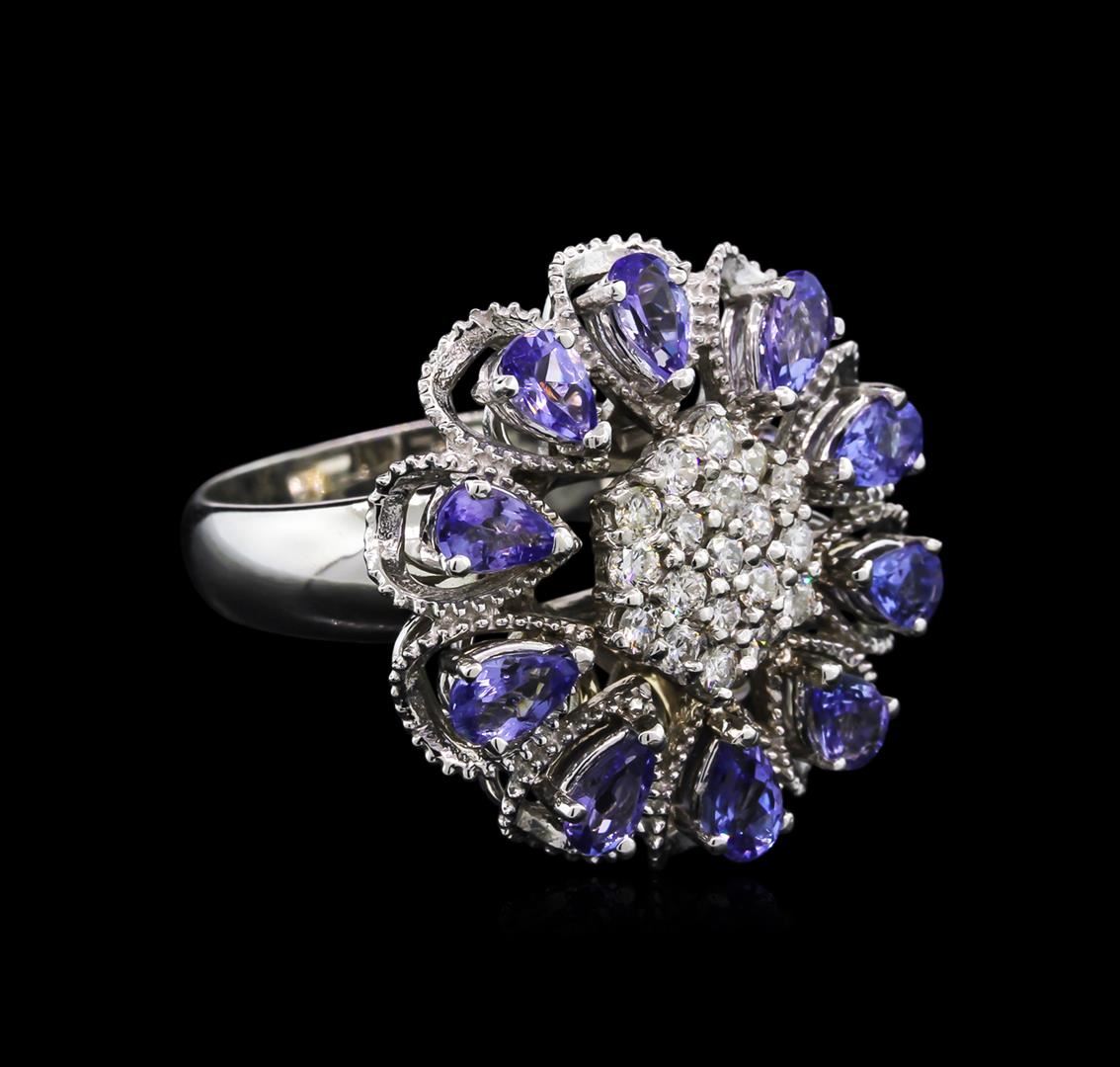 One electronically tested 14KT white gold lady's cast fashion ring with a bright polish finish. The featured ladies ring has a large floral motif with a shank measuring 3.77 millimeters in width. Identified with markings of "14K". Condition is new, good workmanship. Containing: Ten prong set pear modified brilliant cut natural tanzanites, measuring 5.50 x 3.20 x 2.40mm, approximate total weight of 2.80ct., clarity is eye clean, type I, medium light, very slightly grayish, bluish violet color, (GIA bV 4/3), cut is good. Transmitting light with no distortion, transparent. Colored gemstones are presumed to have been subjected to commonly used enhancement processes. Graded in the setting. Twenty prong set round brilliant cut diamonds, measuring 2.00 - 1.90 x 1.27mm (depth est.) approximate total weight of 20 Stones = 0.60ct. Graded in the setting. Clarity: SI-2 to I-1. Color: H - I. Cut Good. Total Weight of Colored Stones 2.80ct. Total Weight of Diamonds 0.60ct. Total Weight of Ring 10.10gm. GAS Appraised at $5,260.00.