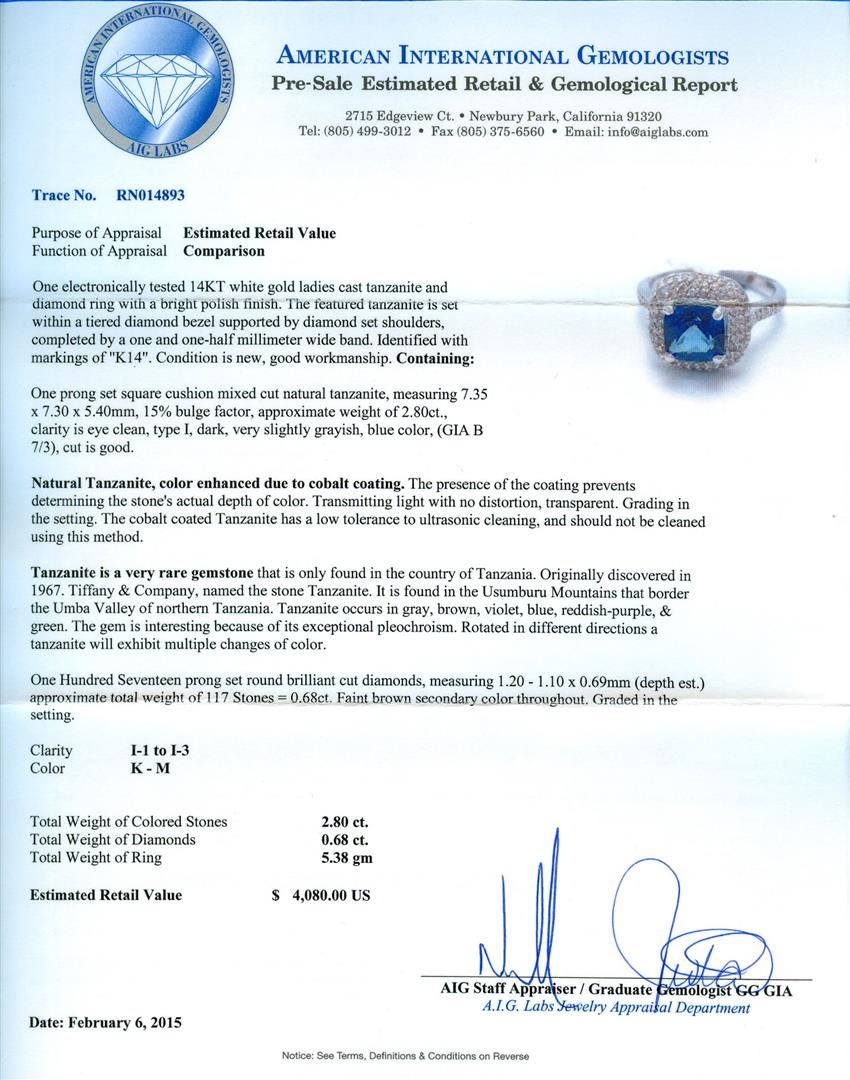 One electronically tested 14KT white gold ladies cast tanzanite and diamond ring with a bright polish finish. The featured tanzanite is set within a tiered diamond bezel supported by diamond set shoulders, completed by a one and one-half millimeter wide band. Identified with markings of "K14". Condition is new, good workmanship. Containing: One prong set square cushion mixed cut natural tanzanite, measuring 7.35 x 7.30 x 5.40mm, 15%. bulge factor, approximate weight of 2.80ct., clarity is eye clean, type I, dark, very slightly grayish, blue color, (GIA B 7/3), cut is good. Natural Tanzanite, color enhanced due to cobalt coating. The presence of the coating prevents determining the stone's actual depth of color. Transmitting light with no distortion, transparent. Grading in the setting. The cobalt coated Tanzanite has a low tolerance to ultrasonic cleaning, and should not be cleaned using this method. Tanzanite is a very rare gemstone that is only found in the country of Tanzania. Originally discovered in 1967. Tiffany & Company, named the stone Tanzanite. It is found in the Usumburu Mountains that border the Umba Valley of northern Tanzania. Tanzanite occurs in gray, brown, violet, blue, reddish-purple, & green. The gem is interesting because of its exceptional pleochroism. Rotated in different directions a tanzanite will exhibit multiple changes of color. One Hundred Seventeen prong set round brilliant cut diamonds, measuring 1.20 - 1.10 x 0.69mm (depth est.) approximate total weight of 117 Stones = 0.68ct. Faint brown secondary color throughout. Graded in the setting. Clarity: I-1 to I-3. Color: K - M. Total Weight of Colored Stones 2.80ct. Total Weight of Diamonds 0.68ct. Total Weight of Ring 5.38gm. AIG Appraised at $4,080.00.