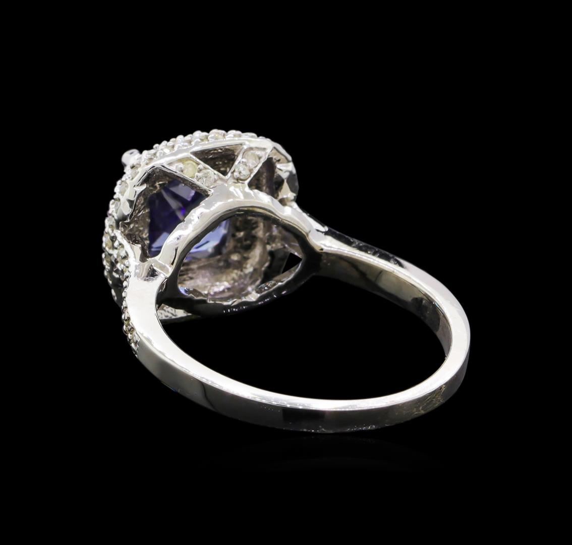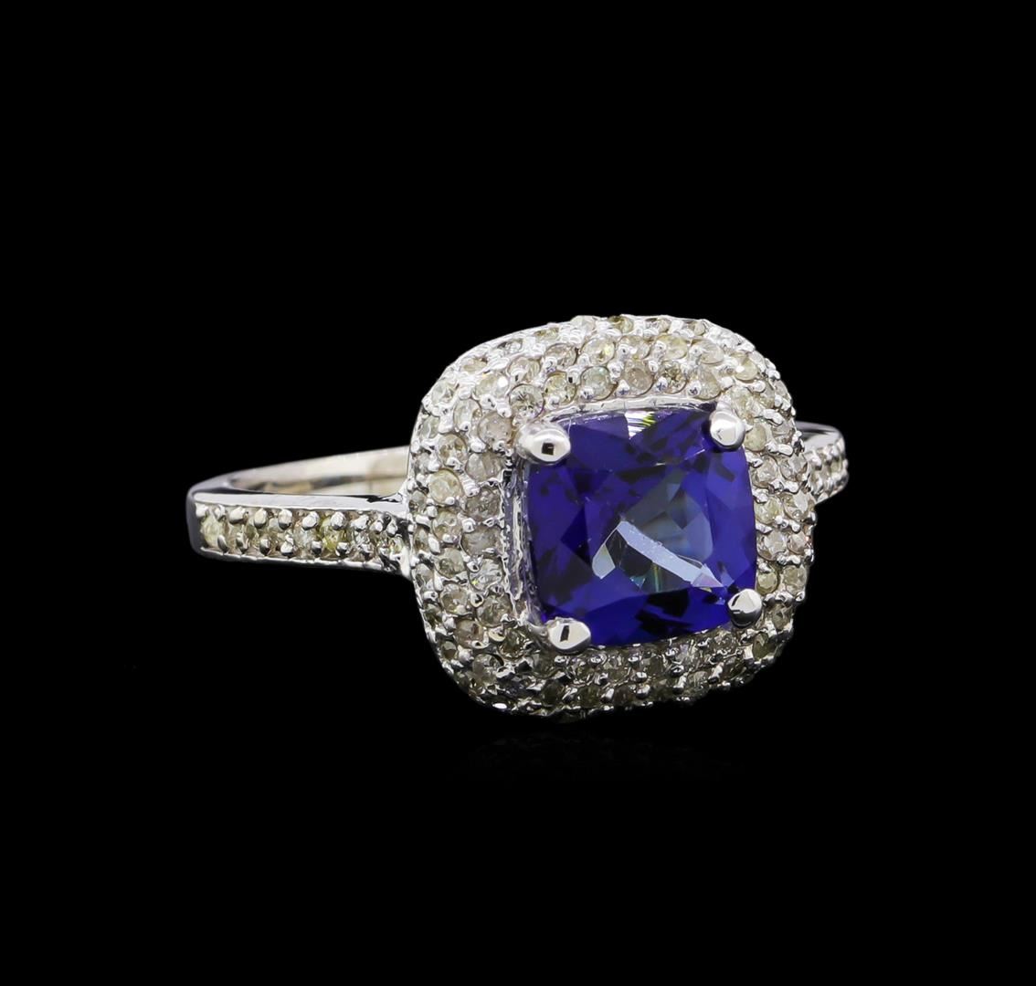 One electronically tested 14KT white gold ladies cast tanzanite and diamond ring with a bright polish finish. The featured tanzanite is set within a tiered diamond bezel supported by diamond set shoulders, completed by a one and one-half millimeter wide band. Identified with markings of "K14". Condition is new, good workmanship. Containing: One prong set square cushion mixed cut natural tanzanite, measuring 7.35 x 7.30 x 5.40mm, 15%. bulge factor, approximate weight of 2.80ct., clarity is eye clean, type I, dark, very slightly grayish, blue color, (GIA B 7/3), cut is good. Natural Tanzanite, color enhanced due to cobalt coating. The presence of the coating prevents determining the stone's actual depth of color. Transmitting light with no distortion, transparent. Grading in the setting. The cobalt coated Tanzanite has a low tolerance to ultrasonic cleaning, and should not be cleaned using this method. Tanzanite is a very rare gemstone that is only found in the country of Tanzania. Originally discovered in 1967. Tiffany & Company, named the stone Tanzanite. It is found in the Usumburu Mountains that border the Umba Valley of northern Tanzania. Tanzanite occurs in gray, brown, violet, blue, reddish-purple, & green. The gem is interesting because of its exceptional pleochroism. Rotated in different directions a tanzanite will exhibit multiple changes of color. One Hundred Seventeen prong set round brilliant cut diamonds, measuring 1.20 - 1.10 x 0.69mm (depth est.) approximate total weight of 117 Stones = 0.68ct. Faint brown secondary color throughout. Graded in the setting. Clarity: I-1 to I-3. Color: K - M. Total Weight of Colored Stones 2.80ct. Total Weight of Diamonds 0.68ct. Total Weight of Ring 5.38gm. AIG Appraised at $4,080.00.