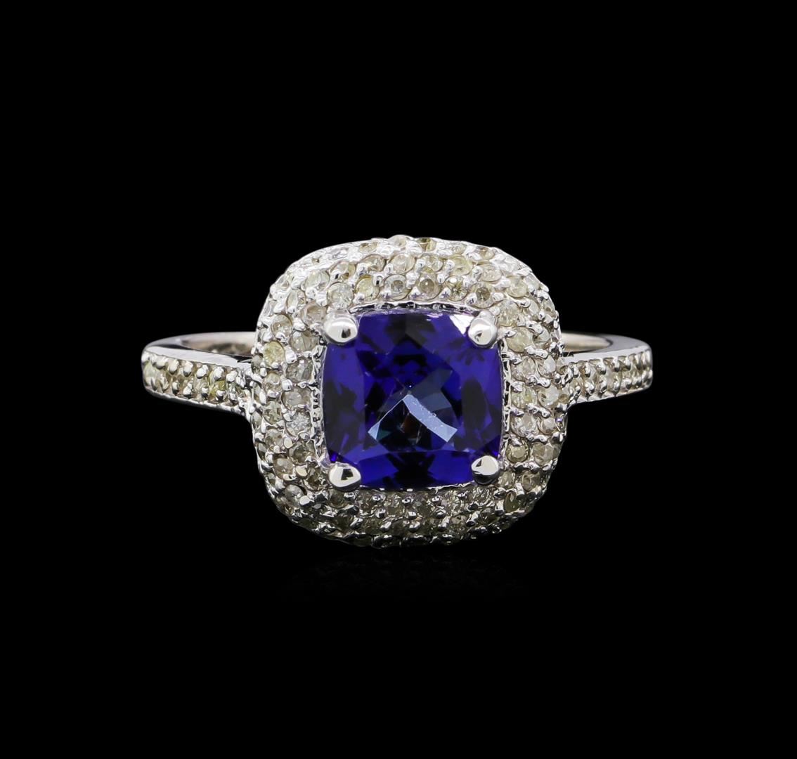 One electronically tested 14KT white gold ladies cast tanzanite and diamond ring with a bright polish finish. The featured tanzanite is set within a tiered diamond bezel supported by diamond set shoulders, completed by a one and one-half millimeter wide band. Identified with markings of "K14". Condition is new, good workmanship. Containing: One prong set square cushion mixed cut natural tanzanite, measuring 7.35 x 7.30 x 5.40mm, 15%. bulge factor, approximate weight of 2.80ct., clarity is eye clean, type I, dark, very slightly grayish, blue color, (GIA B 7/3), cut is good. Natural Tanzanite, color enhanced due to cobalt coating. The presence of the coating prevents determining the stone's actual depth of color. Transmitting light with no distortion, transparent. Grading in the setting. The cobalt coated Tanzanite has a low tolerance to ultrasonic cleaning, and should not be cleaned using this method. Tanzanite is a very rare gemstone that is only found in the country of Tanzania. Originally discovered in 1967. Tiffany & Company, named the stone Tanzanite. It is found in the Usumburu Mountains that border the Umba Valley of northern Tanzania. Tanzanite occurs in gray, brown, violet, blue, reddish-purple, & green. The gem is interesting because of its exceptional pleochroism. Rotated in different directions a tanzanite will exhibit multiple changes of color. One Hundred Seventeen prong set round brilliant cut diamonds, measuring 1.20 - 1.10 x 0.69mm (depth est.) approximate total weight of 117 Stones = 0.68ct. Faint brown secondary color throughout. Graded in the setting. Clarity: I-1 to I-3. Color: K - M. Total Weight of Colored Stones 2.80ct. Total Weight of Diamonds 0.68ct. Total Weight of Ring 5.38gm. AIG Appraised at $4,080.00.