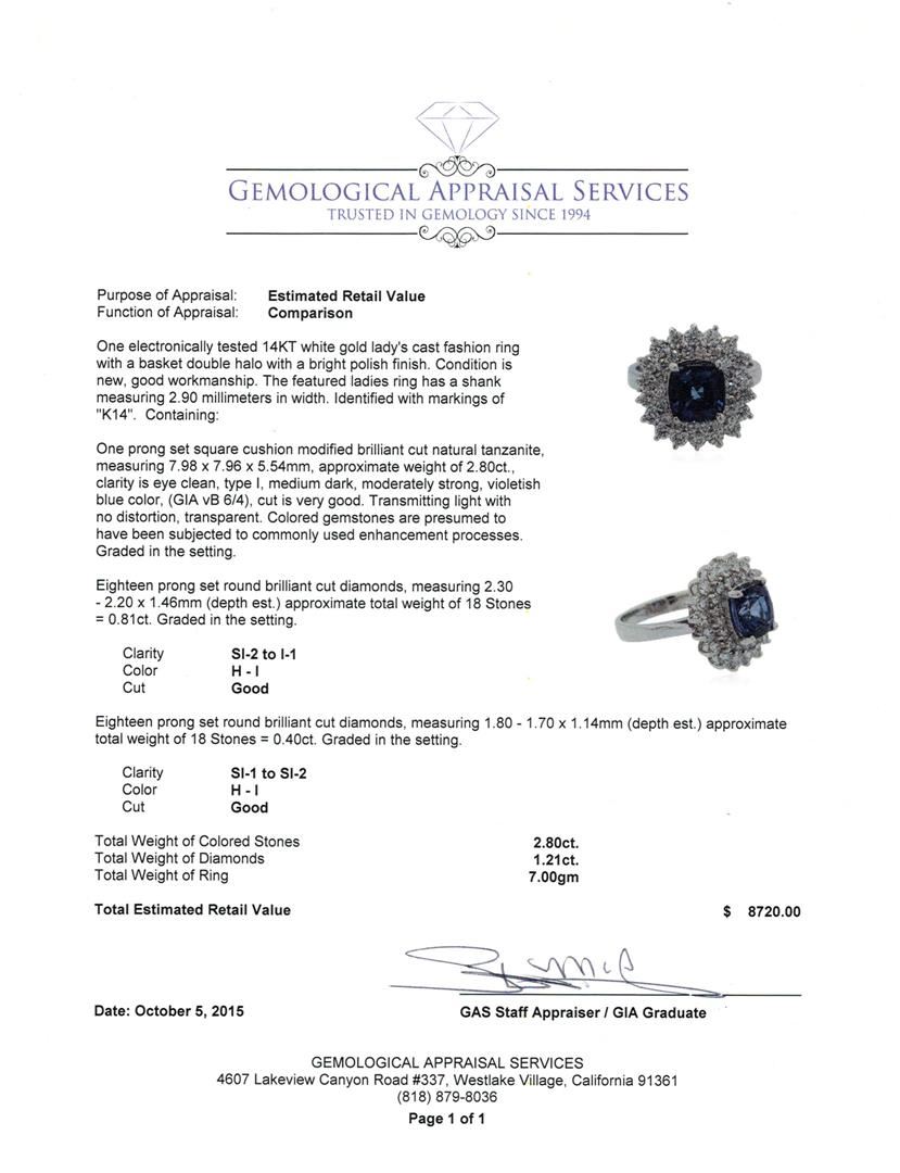 One electronically tested 14KT white gold lady's cast fashion ring with a basket double halo with a bright polish finish. The featured ladies ring has a shank measuring 2.90 millimeters in width. Identified with markings of "K14". Condition is new, good workmanship. Containing: One prong set square cushion modified brilliant cut natural tanzanite, measuring 7.98 x 7.96 x 5.54mm, approximate weight of 2.80ct., clarity is eye clean, type I, medium dark, moderately strong, violetish blue color, (GIA vB 6/4), cut is very good. Transmitting light with no distortion, transparent. Colored gemstones are presumed to have been subjected to commonly used enhancement processes. Graded in the setting. Eighteen prong set round brilliant cut diamonds, measuring 2.30 - 2.20 x 1.46mm (depth est.) approximate total weight of 18 Stones = 0.81ct. Graded in the setting. Clarity: SI-2 to I-1. Color: H - I. Cut Good Eighteen prong set round brilliant cut diamonds, measuring 1.80 - 1.70 x 1.14mm (depth est.) approximate total weight of 18 Stones = 0.40ct. Graded in the setting. Clarity: SI-1 to SI-2. Color: H - I. Cut Good. Total Weight of Colored Stones 2.80ct. Total Weight of Diamonds 1.21ct. Total Weight of Ring 7.00gm. GAS Appraised at $8,720.00.