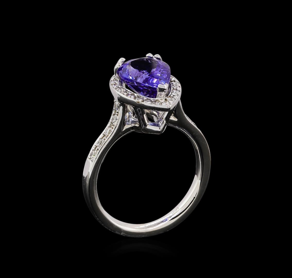 One electronically tested 14KT white gold lady's cast fashion ring with a cathedral halo with a bright polish finish. The featured lady's ring has a shank measuring 2.50 millimeters wide. Identified with markings of '14K'. Condition is new, good workmanship. Containing: One prong set pear modified brilliant cut natural tanzanite, measuring 11.06 x 7.77 x 5.20mm, (depth est.) approximate weight of 2.80ct., clarity is eye clean, medium dark, strong, violetish blue color, (GIA vB 6/5), cut is excellent. Transmitting light with no distortion, transparent. Colored gemstones are presumed to have been subjected to commonly used enhancement processes. Graded in the setting. Ten prong set round brilliant cut diamonds, measuring 1.70 - 1.65 x 1.04mm (depth est.) approximate total weight of 10 Stones = 0.18ct. Graded in the setting. Clarity SI-1 to SI-2. Color: H - I Cut Good Twenty-Two prong set round brilliant cut diamonds, measuring 1.35 - 1.25 x 0.81mm (depth est.) approximate total weight of 22 Stones = 0.18ct. Graded in the setting. Clarity SI-1 to SI-2. Color: H - I Cut Good. Total Weight of Colored Stones 2.80ct.. Total Weight of Diamonds 0.36ct.. Total Weight of Ring 5.70gm.