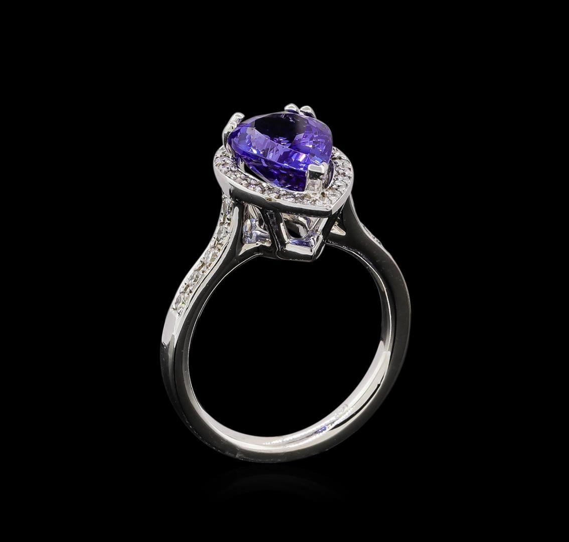 One electronically tested 14KT white gold lady's cast fashion ring with a cathedral halo with a bright polish finish. The featured lady's ring has a shank measuring 2.50 millimeters wide. Identified with markings of '14K'. Condition is new, good workmanship. Containing: One prong set pear modified brilliant cut natural tanzanite, measuring 11.06 x 7.77 x 5.20mm, (depth est.) approximate weight of 2.80 ct., clarity is eye clean, medium dark, strong, violetish blue color, (GIA vB 6/5), cut is excellent. Transmitting light with no distortion, transparent. Colored gemstones are presumed to have been subjected to commonly used enhancement processes. Graded in the setting. Ten prong set round brilliant cut diamonds, measuring 1.70 - 1.65 x 1.04mm (depth est.) approximate total weight of 10 Stones = 0.18ct. Graded in the setting. Clarity SI-1 to SI-2. Color: H - I Cut Good Twenty-Two prong set round brilliant cut diamonds, measuring 1.35 - 1.25 x 0.81mm (depth est.) approximate total weight of 22 Stones = 0.18ct. Graded in the setting. Clarity SI-1 to SI-2. Color: H - I Cut Good. Total Weight of Colored Stones 2.80 ct.. Total Weight of Diamonds 0.36ct.. Total Weight of Ring 5.70gm.