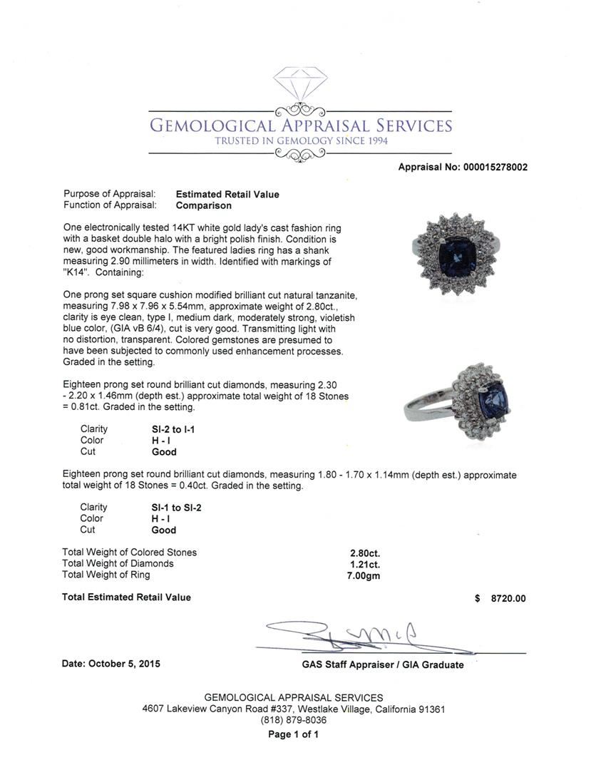 One electronically tested 14KT white gold lady's cast fashion ring with a basket double halo with a bright polish finish. The featured ladies ring has a shank measuring 2.90 millimeters in width. Identified with markings of "K14". Condition is new, good workmanship. Containing: One prong set square cushion modified brilliant cut natural tanzanite, measuring 7.98 x 7.96 x 5.54mm, approximate weight of 2.80ct., clarity is eye clean, type I, medium dark, moderately strong, violetish blue color, (GIA vB 6/4), cut is very good. Transmitting light with no distortion, transparent. Colored gemstones are presumed to have been subjected to commonly used enhancement processes. Graded in the setting. Eighteen prong set round brilliant cut diamonds, measuring 2.30 - 2.20 x 1.46mm (depth est.) approximate total weight of 18 Stones = 0.81ct. Graded in the setting. Clarity: SI-2 to I-1. Color: H - I. Cut Good Eighteen prong set round brilliant cut diamonds, measuring 1.80 - 1.70 x 1.14mm (depth est.) approximate total weight of 18 Stones = 0.40ct. Graded in the setting. Clarity: SI-1 to SI-2. Color: H - I. Cut Good. Total Weight of Colored Stones 2.80ct. Total Weight of Diamonds 1.21ct. Total Weight of Ring 7.00gm. GAS Appraised at $8,720.00.