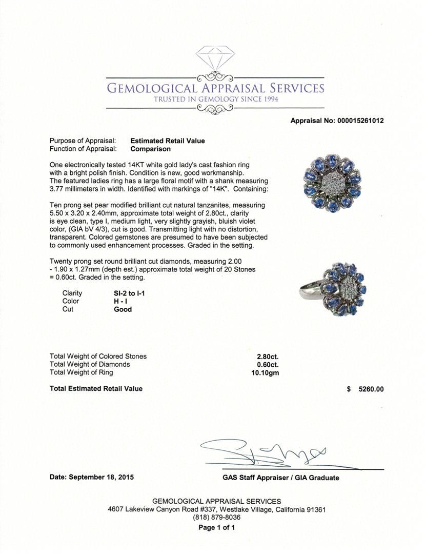 One electronically tested 14KT white gold lady's cast fashion ring with a bright polish finish. The featured ladies ring has a large floral motif with a shank measuring 3.77 millimeters in width. Identified with markings of "14K". Condition is new, good workmanship. Containing: Ten prong set pear modified brilliant cut natural tanzanites, measuring 5.50 x 3.20 x 2.40mm, approximate total weight of 2.80ct., clarity is eye clean, type I, medium light, very slightly grayish, bluish violet color, (GIA bV 4/3), cut is good. Transmitting light with no distortion, transparent. Colored gemstones are presumed to have been subjected to commonly used enhancement processes. Graded in the setting. Twenty prong set round brilliant cut diamonds, measuring 2.00 - 1.90 x 1.27mm (depth est.) approximate total weight of 20 Stones = 0.60ct. Graded in the setting. Clarity: SI-2 to I-1. Color: H - I. Cut Good. Total Weight of Colored Stones 2.80ct. Total Weight of Diamonds 0.60ct. Total Weight of Ring 10.10gm. GAS Appraised at $5,260.00.