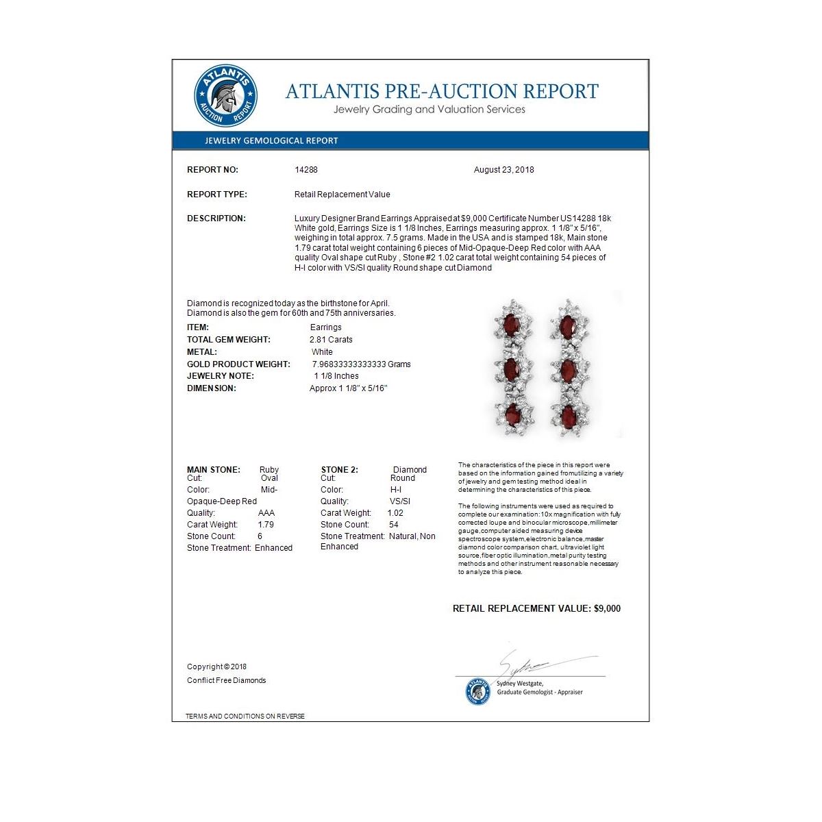 REF-116A8X -14288 ---- 2.81 CTW Ruby & Diamond Earrings 18K White Gold ---- Luxury Designer Brand Earrings Appraised at $9,000 Certificate Number US14288 18k White gold, Earrings Size is 1 1/8 Inches, Earrings measuring approx. 1 1/8" x 5/16", weighing in total approx. 7.5 grams. Made in the USA and is stamped 18k, Main stone 1.79 carat total weight containing 6 pieces of Mid-Opaque-Deep Red color with AAA quality Oval shape cut Ruby , Stone #2 1.02 carat total weight containing 54 pieces of H-I color with VS/SI quality Round shape cut Diamond