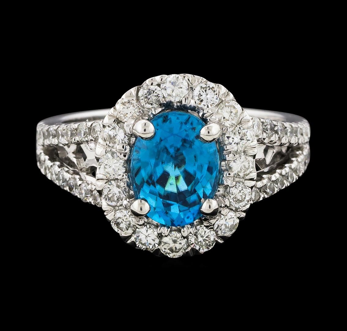 One electronically tested 14KT white gold lady's cast fashion ring with a split shank basket halo with a bright polish finish. The featured lady's ring has a shank measuring 2.73 millimeters wide. Identified with markings of '14K'. Condition is new, good workmanship. Containing: One prong set oval modified mixed cut natural blue zircon, measuring 8.07 x 6.11 x 4.30mm, (depth est.) 10%. bulge factor, approximate weight of 2.31ct., clarity is eye clean, medium dark, moderately strong, very strongly greenish blue color, (GIA vstgB 6/4), cut is good. Transmitting light with no distortion, transparent. Colored gemstones are presumed to have been subjected to commonly used enhancement processes. Graded in the setting. Sixteen prong set round brilliant cut diamonds, measuring 2.10 - 2.00 x 1.23mm (depth est.) approximate total weight of 16 Stones = 0.50ct. Graded in the setting. Clarity SI-1 to SI-2. Color: H - I Cut Good Thirty-Two prong set round brilliant cut diamonds, measuring 1.40 - 1.30 x 0.81mm (depth est.) approximate total weight of 32 Stones = 0.29ct. Graded in the setting. Clarity VS-2 to SI-1. Color: G - H Cut Good. Total Weight of Colored Stones 2.31ct.. Total Weight of Diamonds 0.79ct.. Total Weight of Ring 5.10gm. GAS Appraised at $4,170.00.