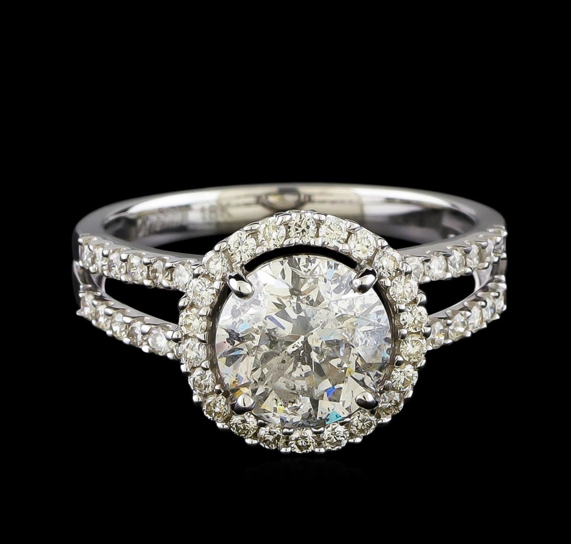 One electronically tested 18KT white gold ladies cast diamond unity ring with a bright polish finish. The featured diamond is set within a diamond bezel supported by a diamond set under gallery and diamond set split shoulders, completed by a two millimeter wide band. Trademark is Orianne. Identified with markings of "18K". Condition is new, good workmanship. Containing: One prong set round brilliant cut diamond, measuring 8.05 - 8.00 x 5.09mm (depth est.), 8.00.%. GTCF approximate weight of 2.20ct with a faint blue fluorescence. Graded in the setting. Clarity: I-2. Color: G. Depth 63.4%. Table 54.8%. Sixty prong set round brilliant cut diamonds approximate total weight of 60 Stones = 0.61ct. Graded in the setting. Clarity: I-1 to I-2. Color: G - I. Total Weight of Diamonds 2.81ct. Total Weight of Ring 4.53gm. AIG Appraised at $20,810.00.