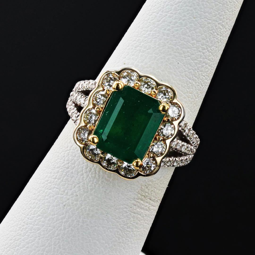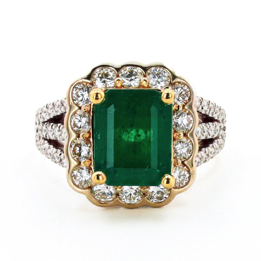 One polished, stamped, and tested 18K yellow and white gold ring with a bright finish. The ring is mounted with: I genuine GIA certified emerald center stone weighing 2.81 carats, and 62 genuine round diamonds weighing approximately 1.02 carats. This item